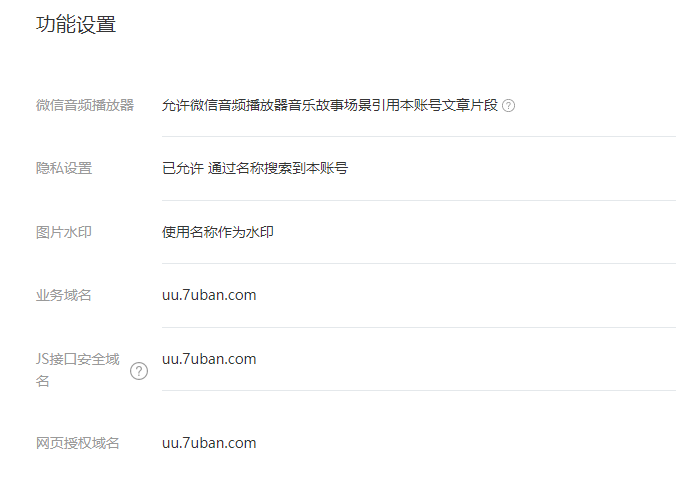 2、在微信公众平台获取AppID和AppSecret;功能设置中配置了业务域名、JS接口安全域名、网页授权域名;