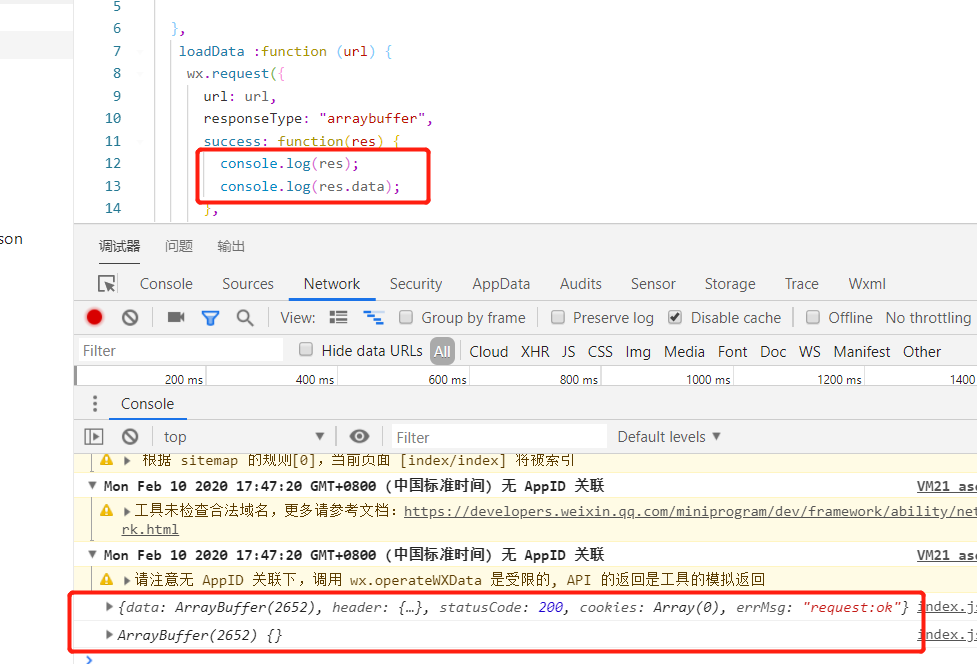 问题描述:使用开发工具直接编译可以加载自定义文件获取到res.data属性。如下图