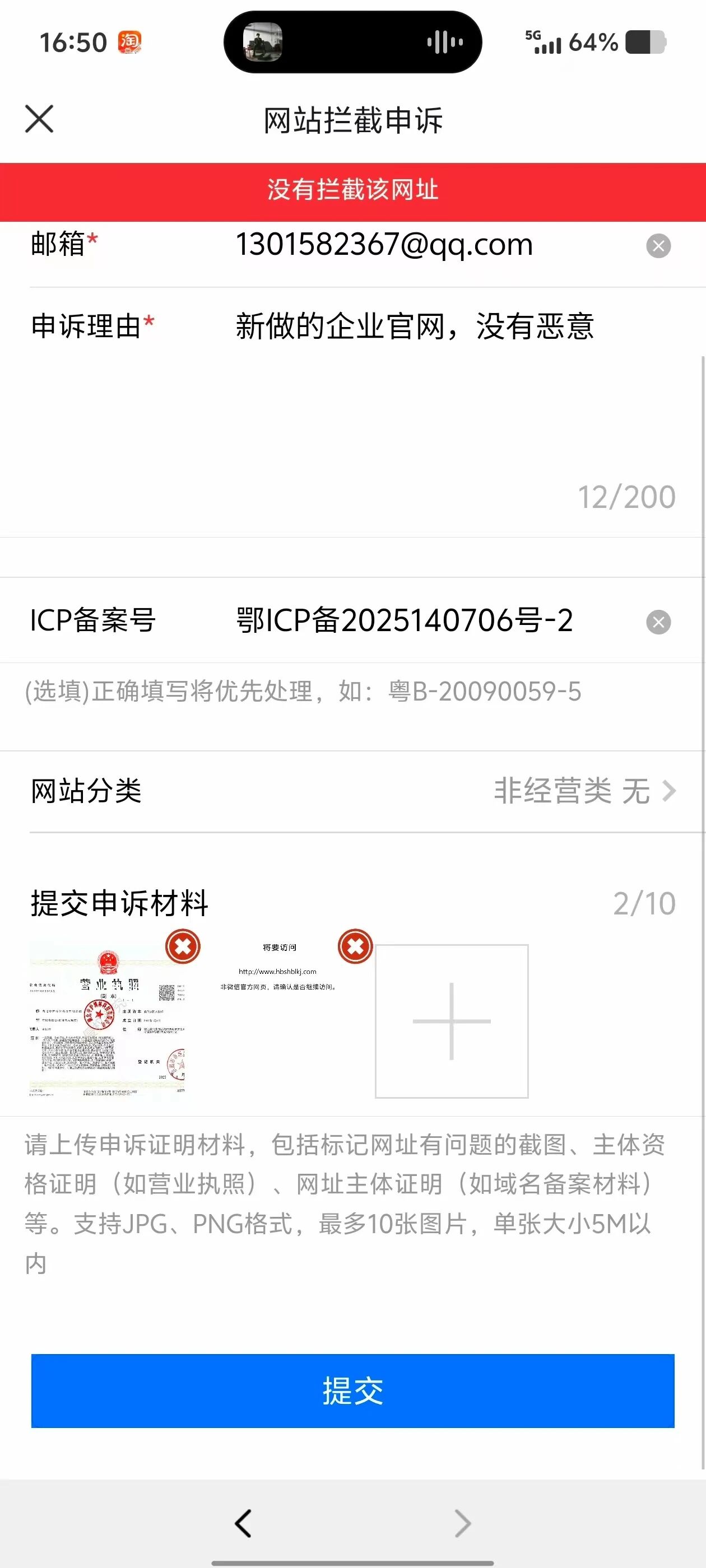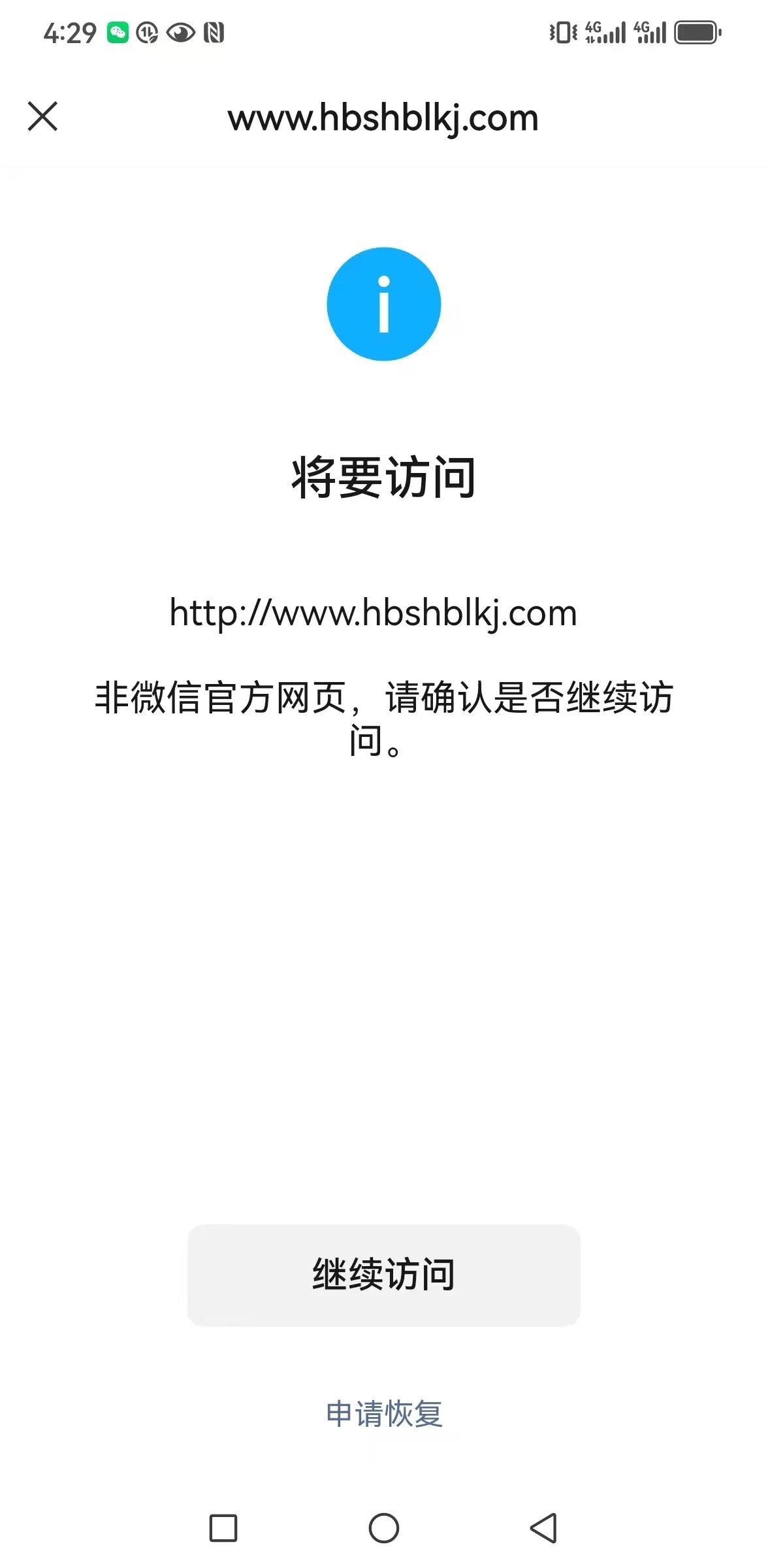 刚上线的企业官网http://www.hbshblkj.com 企业是做一次性餐具的 网站上主要就是企业介绍跟产品的展示 没有什么违规的链接跟内容 微信里打开网址就是会有一个非腾讯官方链接的提示 多次申诉都没有用 这个应该怎么处理啊