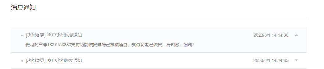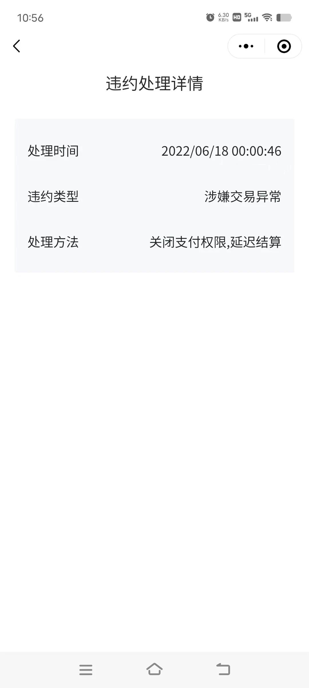 去年6月份显示涉嫌交易异常违规处理方法是关闭支付权限延迟结算,去年7月份申诉该问题解决方法却是恢复提现。