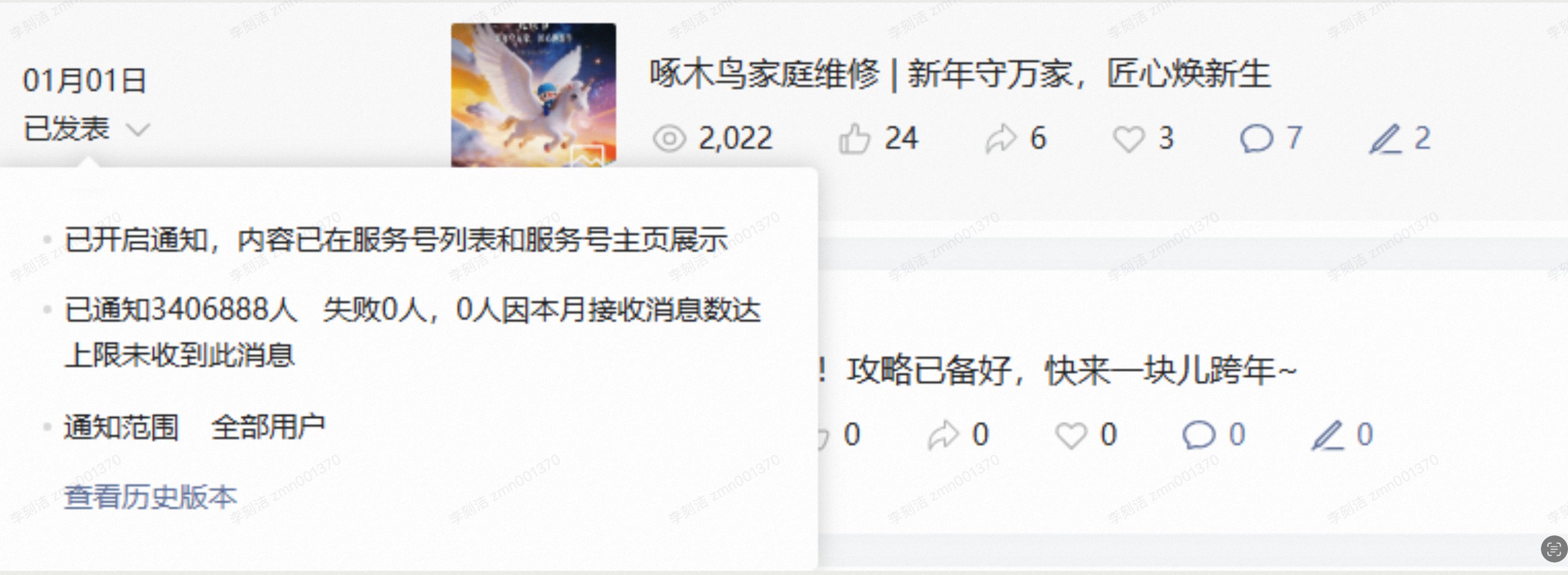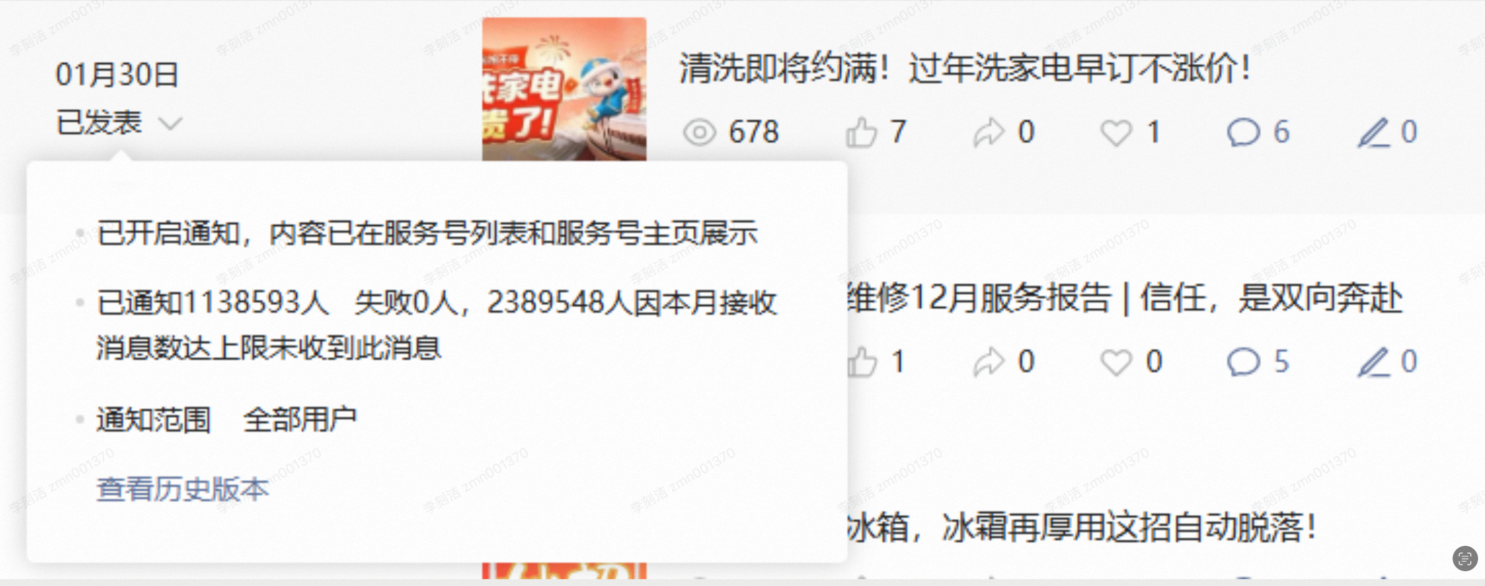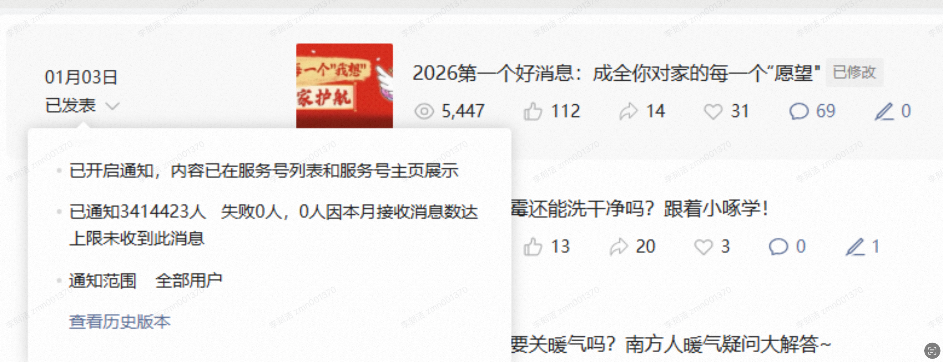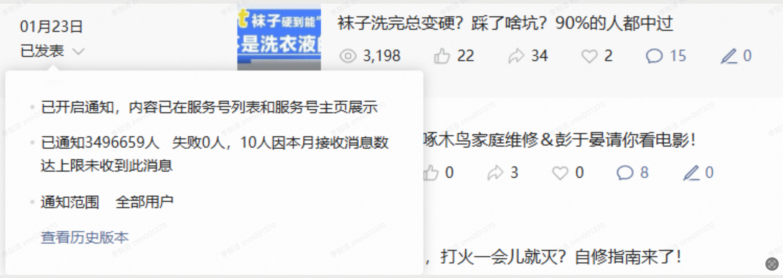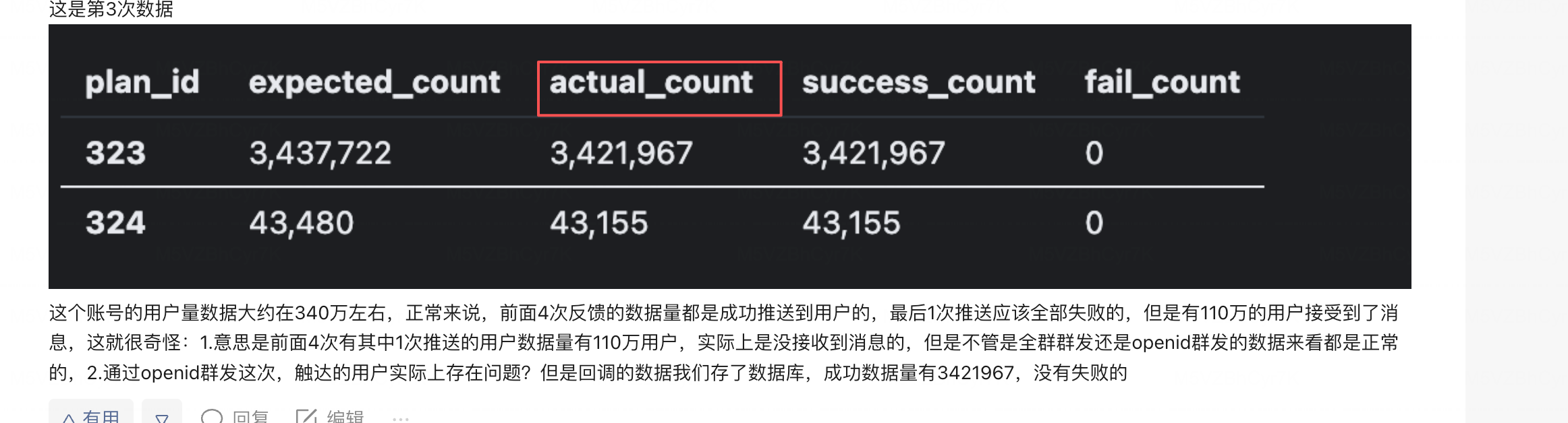 这个账号的用户量数据大约在340万左右,正常来说,前面4次反馈的数据量都是成功推送到用户的,最后1次推送应该全部失败的,但是有110万的用户接受到了消息,这就很奇怪:1.意思是前面4次有其中1次推送的用户数据量有110万用户,实际上是没接收到消息的,但是不管是全群群发还是openid群发的数据来看都是正常的,2.通过openid群发这次,触达的用户实际上存在问题?但是回调的数据我们存了数据库,成功数据量有3421967,没有失败的