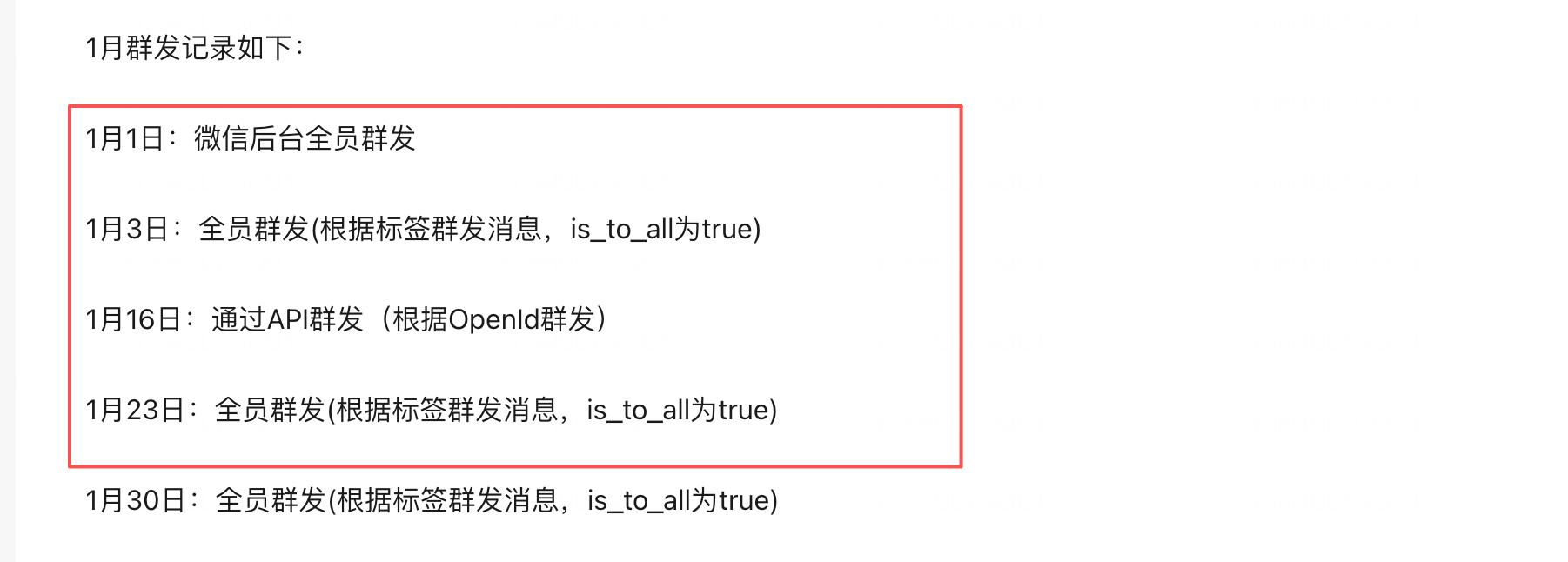 按规则每月4次,1月已用完。但1月30日第5次群发,仍有约100万用户成功触达。请帮忙核实:API群发是否正确消耗了用户额度?是否有数据异常?