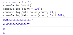 varcount = 1 / 15;console.log(count);console.log(count * 100);console.log(Math.round(count, 2));console.log(Math.round(count, 2) * 100);