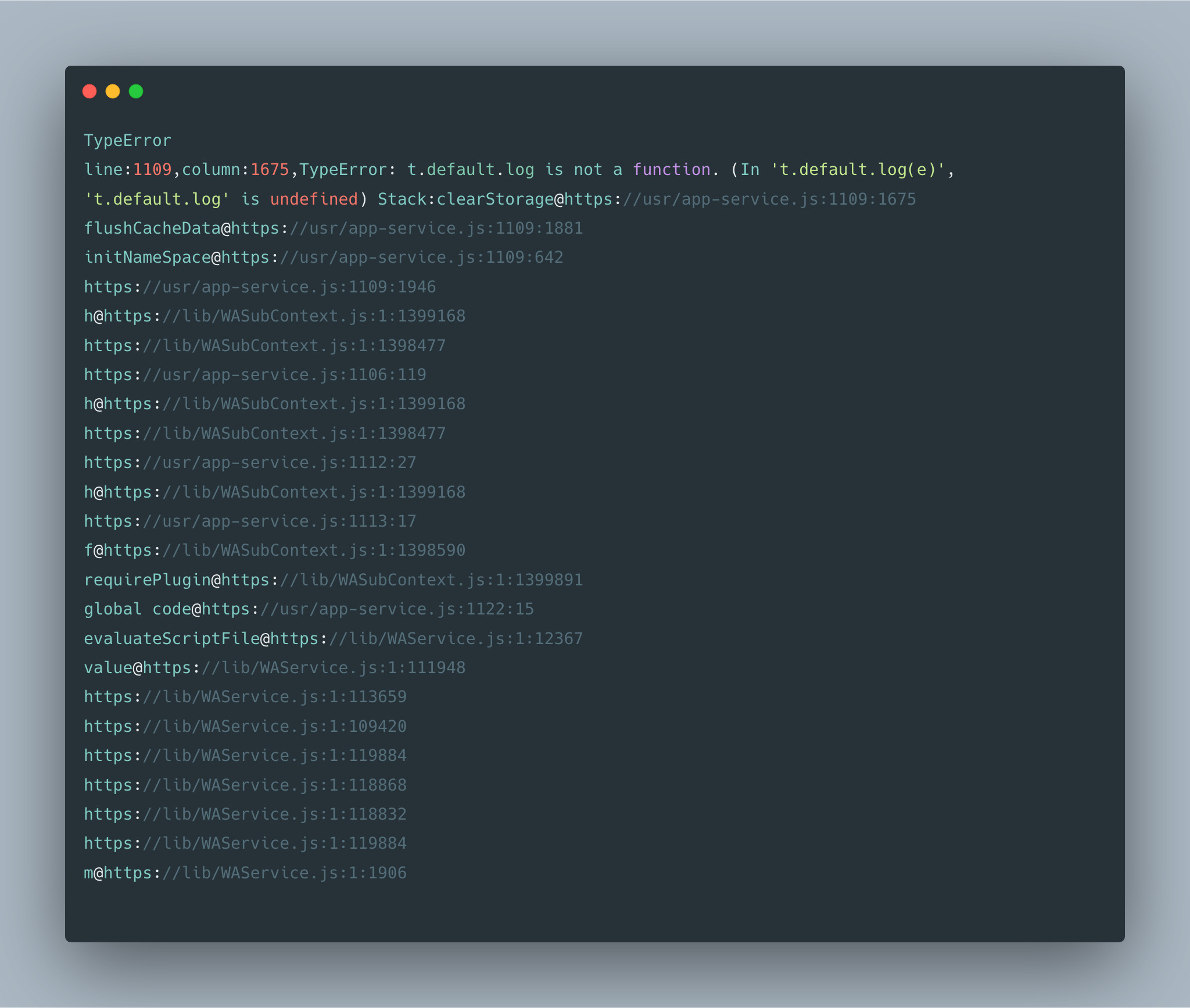 TypeErrorline:1109,column:1675,TypeError: t.default.log is not a function. (In 't.default.log(e)', 't.default.log' is undefined) Stack:clearStorage@https://usr/app-service.js:1109:1675flushCacheData@https://usr/app-service.js:1109:1881initNameSpace@https://usr/app-service.js:1109:642https://usr/app-service.js:1109:1946h@https://lib/WASubContext.js:1:1399168https://lib/WASubContext.js:1:1398477。。https://usr/app-service.js:1106:119h@https://lib/WASubContext.js:1:1399168https://lib/WASubContext.js:1:1398477https://usr/app-service.js:1112:27h@https://lib/WASubContext.js:1:1399168https://usr/app-service.js:1113:17f@https://lib/WASubContext.js:1:1398590requirePlugin@https://lib/WASubContext.js:1:1399891global code@https://usr/app-service.js:1122:15evaluateScriptFile@https://lib/WAService.js:1:12367value@https://lib/WAService.js:1:111948https://lib/WAService.js:1:113659https://lib/WAService.js:1:109420https://lib/WAService.js:1:119884https://lib/WAService.js:1:118868https://lib/WAService.js:1:118832https://lib/WAService.js:1:119884m@https://lib/WAService.js:1:1906 |