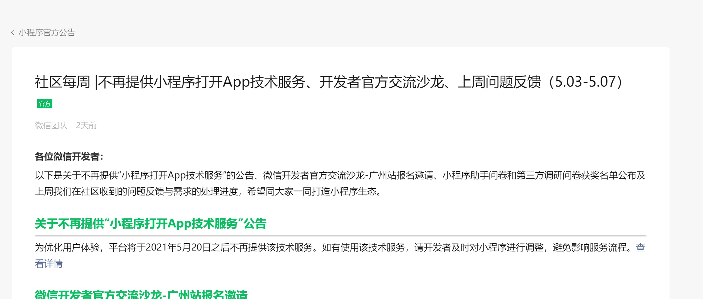 社区看到了这个帖子,特来问下,由于我们小程序是一个收银台,有app拉起小程序进行支付,支付完了再由小程序跳回到app,我想问下这个功能再20号被禁止了吗? 看官方是说关闭了小程序打开app的功能。但是我查阅文档发现,只有当app拉起小程序时,小程序才能跳回到app。小程序不能本身,自己拉起任意app的,所以官方是单方面阻断可小程序跳回app的功能?还是只是我理解错误,小程序可以打开任意app,官方把这个功能给禁用了