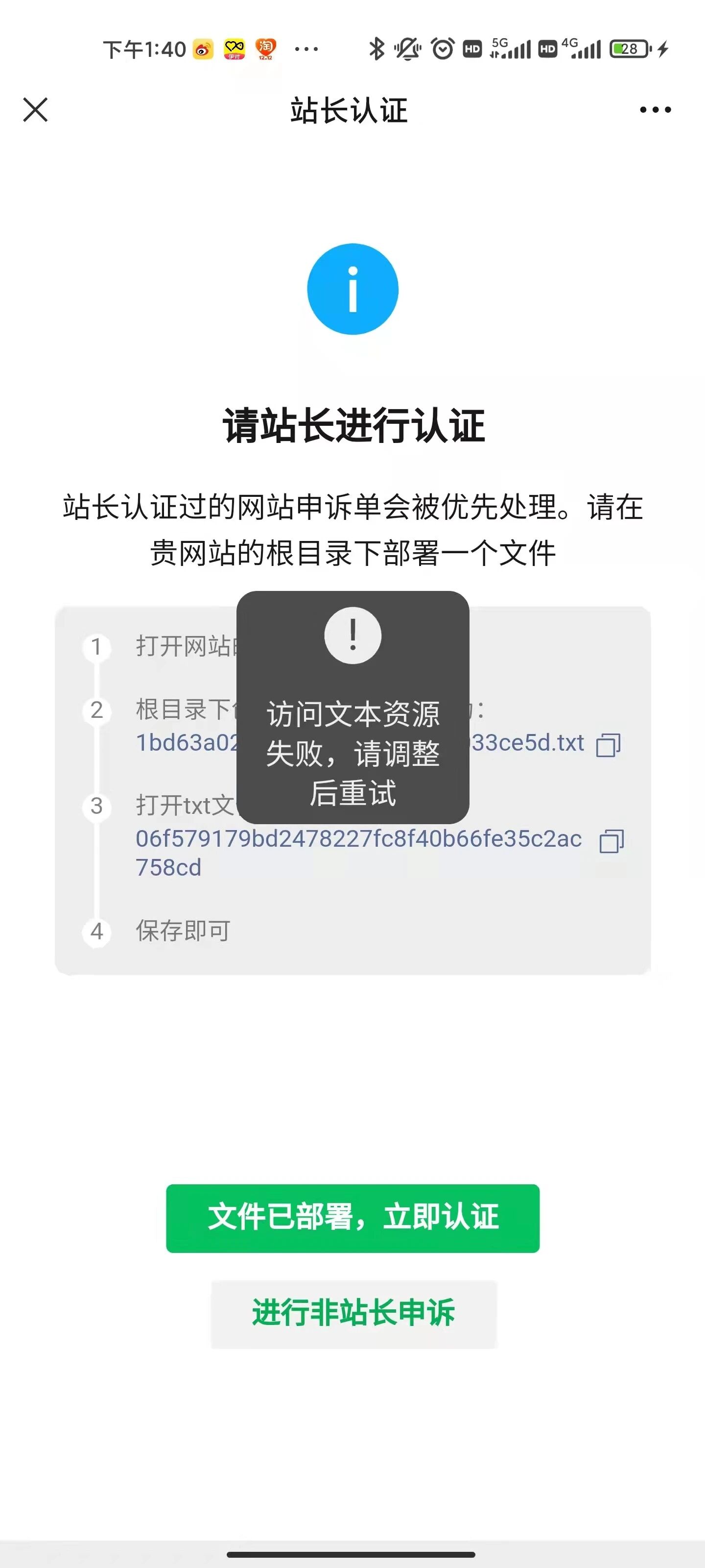 微信域名ddls.xzssfj.cn不能访问,在做进行站长申诉时,已经在项目根目录下放置了txt,提示如图: