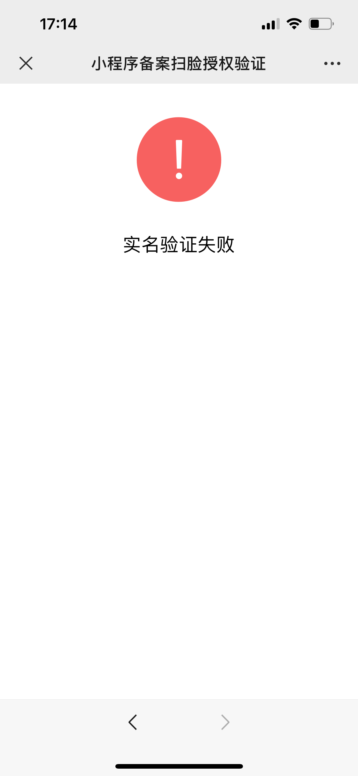 你好,小程序备案人脸核身扫码授权成功后出现“实名验证失败”提示,一般是由于填写的小程序负责人信息与实际扫码的微信号实名信息不一致导致,建议小程序负责人填写备案小程序管理员信息,并用小程序管理员微信号进行人脸核身。
