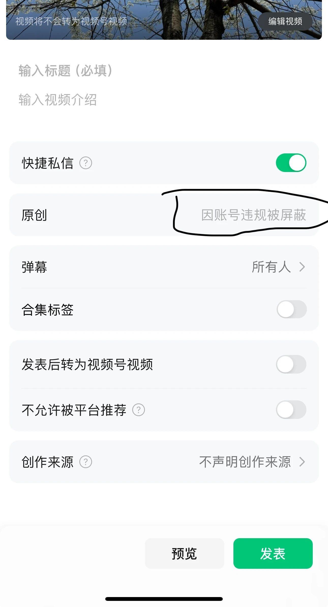 在公众号发布自己制作的视频,想开启原创功能,但该功能显示“因账号违规被屏蔽”,此前发过几个视频,但都没有标过原创,也从来没有收到过违规通知,请问专业平台大神是怎么回事嘞?