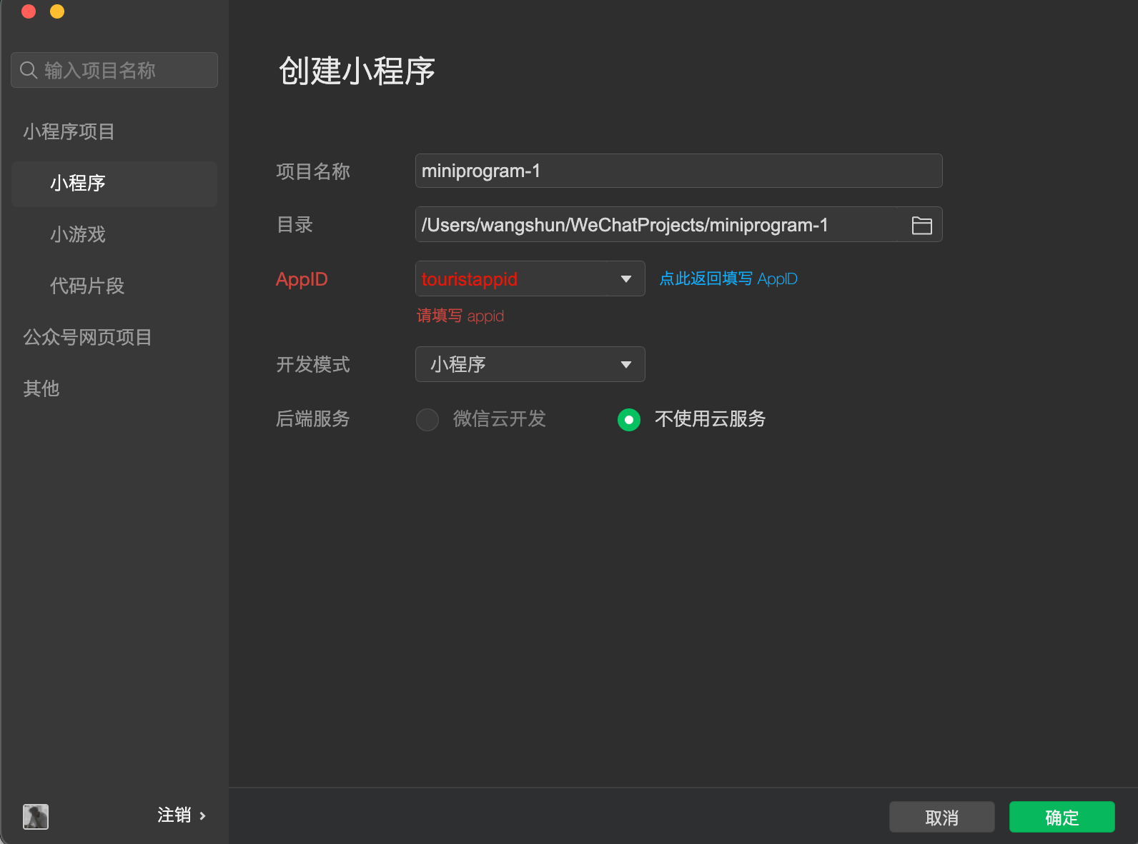 点击游客模式,点击确定,明明填了appid还提示请填写appid