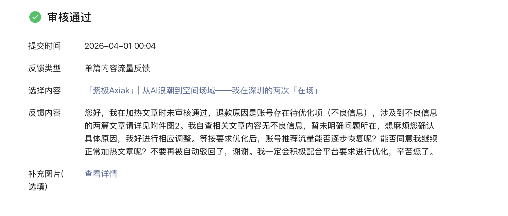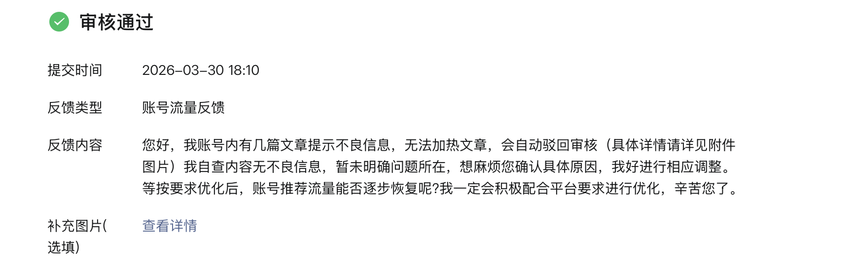 您好,我在加热文章时未审核通过,退款原因是账号存在待优化项(不良信息),涉及到不良信息的问题已通过账号检测功能反馈处理,已审核通过并且反馈账号目前正常,没有问题。我自查相关文章内容无不良信息,暂未明确问题所在,想麻烦您确认具体原因,我好进行相应调整。等按要求优化后,账号推荐流量能否逐步恢复呢?能否同意我继续正常加热文章呢?不要再被自动驳回了,谢谢。我一定会积极配合平台要求进行优化,辛苦您了。