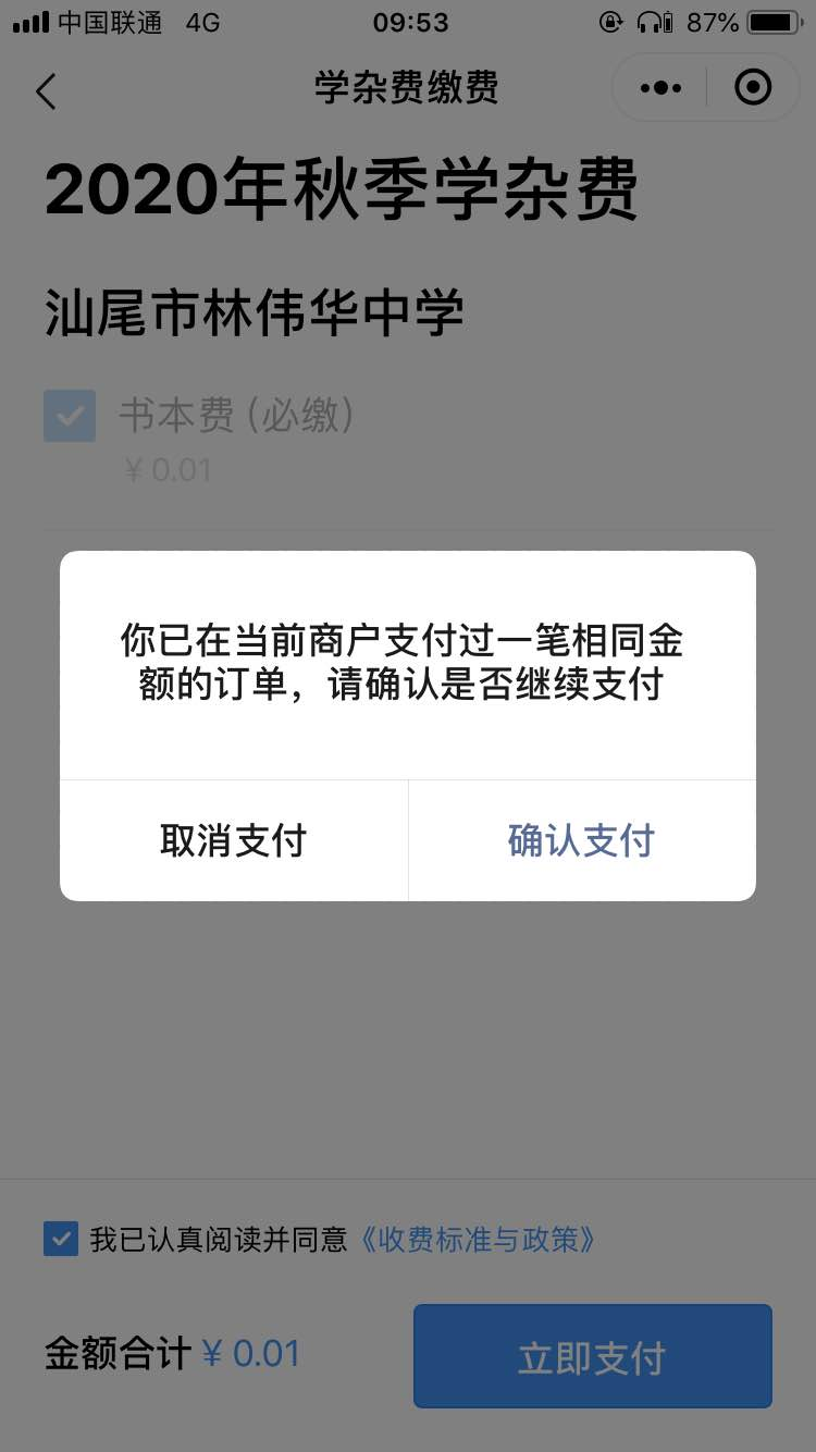 这是微信内部对于相同金额订单防止重复支付的一个校验,点击确认支付即可。