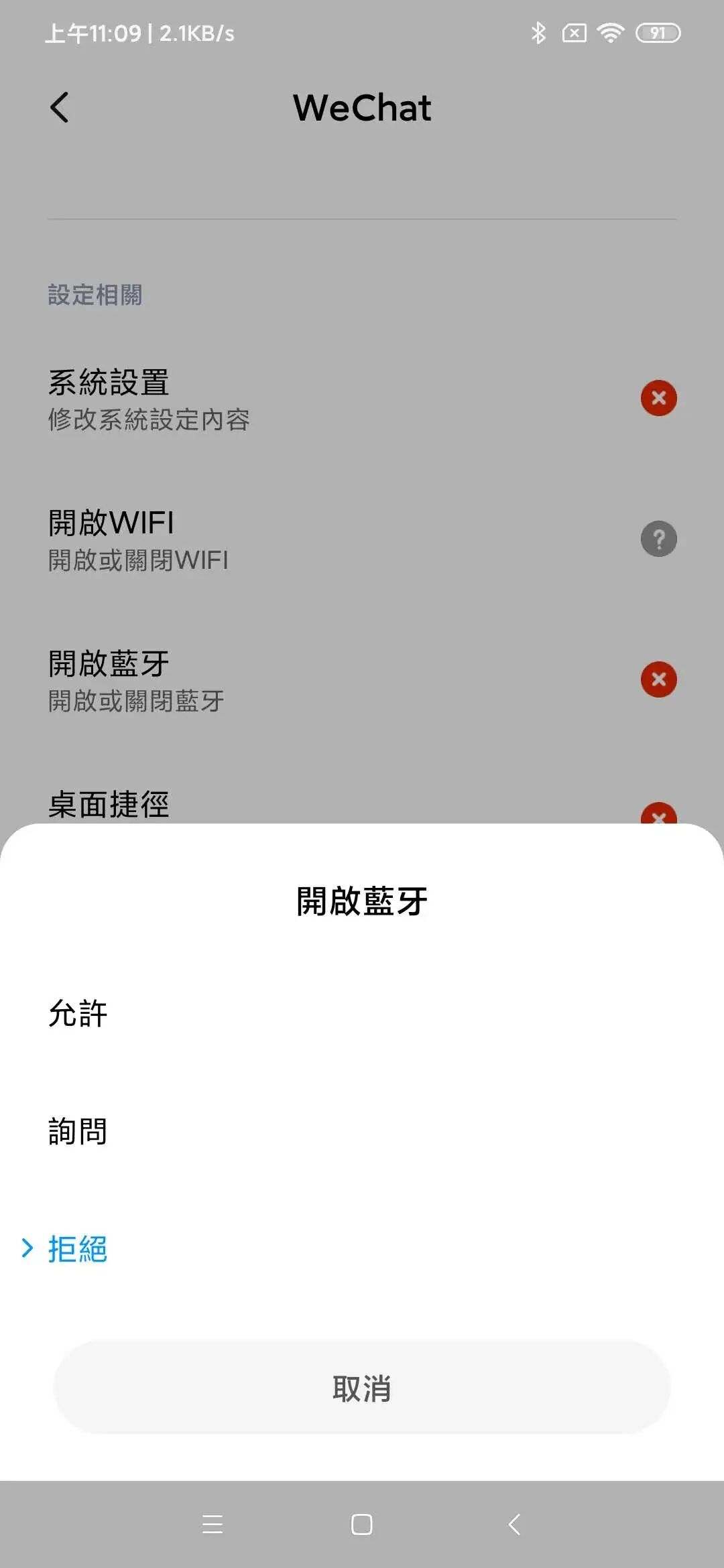 如果打开了系统蓝牙还不行,提示他去系统设置中允许微信访问蓝牙权限,这是把微信访问系统蓝牙的权限给禁用了。