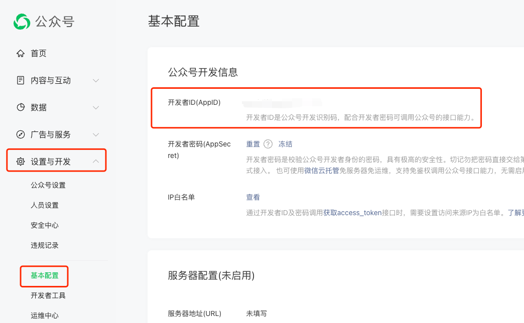 登录公众号后台 https://mp.weixin.qq.com/ ——设置与开发——基本配置 里面查看AppID。