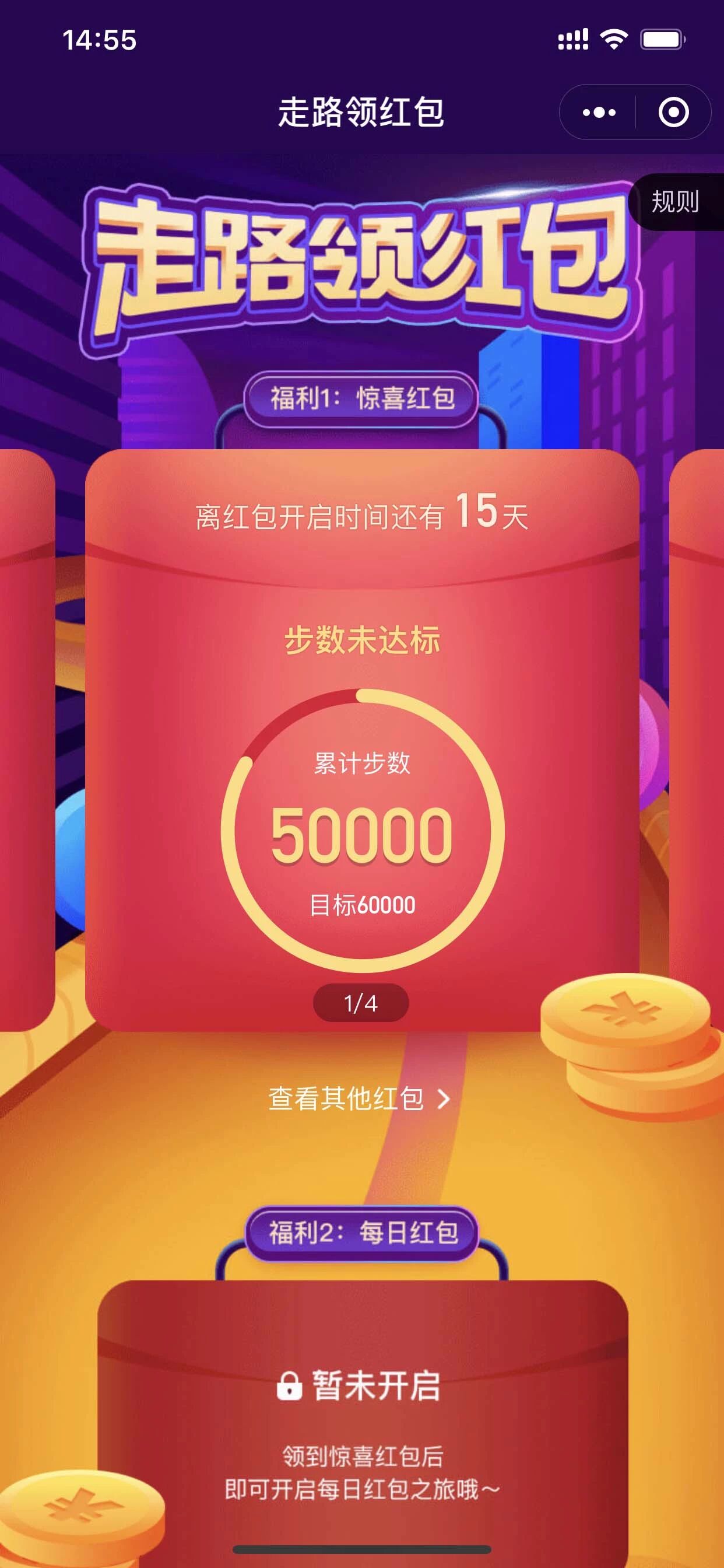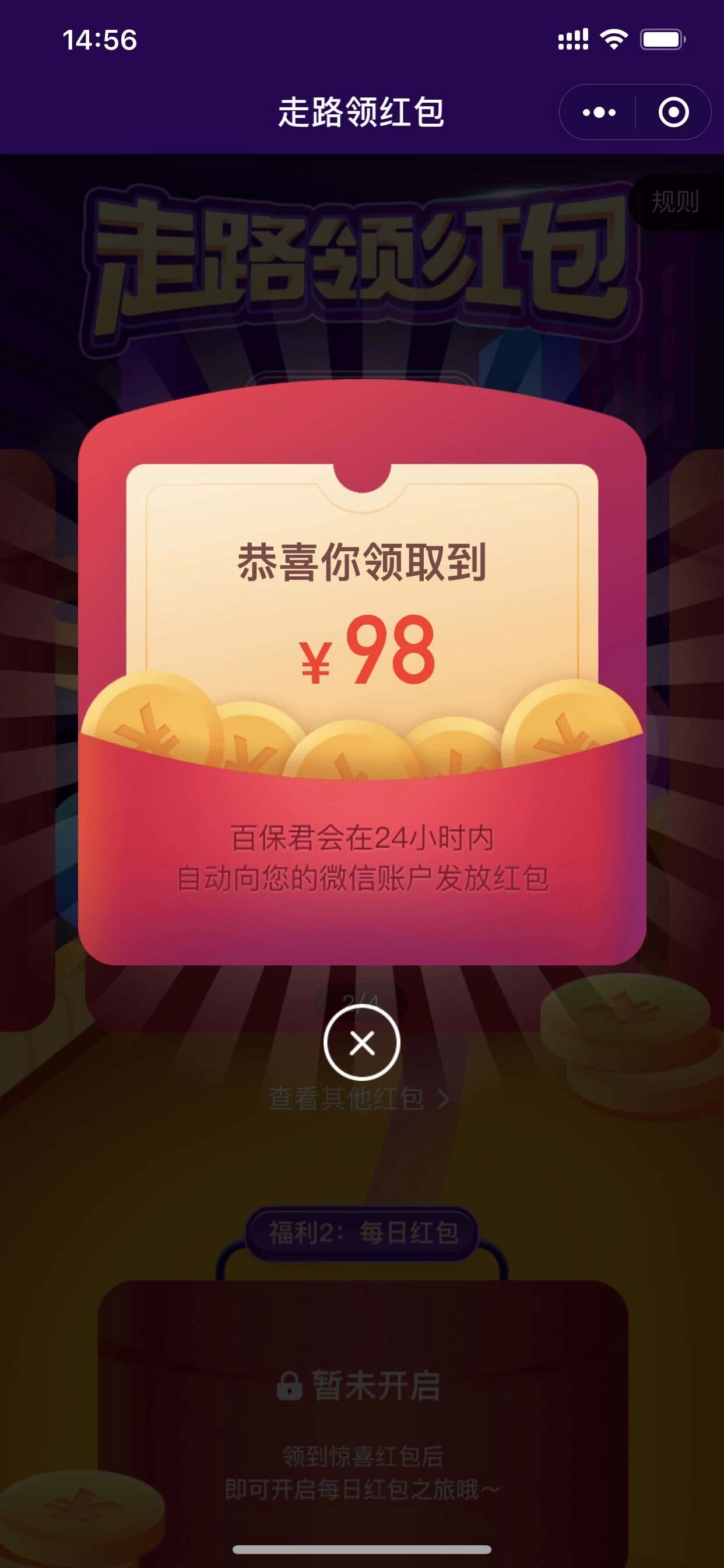 由于这个小程序有前置条件,需要成为百保君会员,所以审核时应该无法看到前置的领取红包页面和运动页面,现在我附上前置页面的截图: