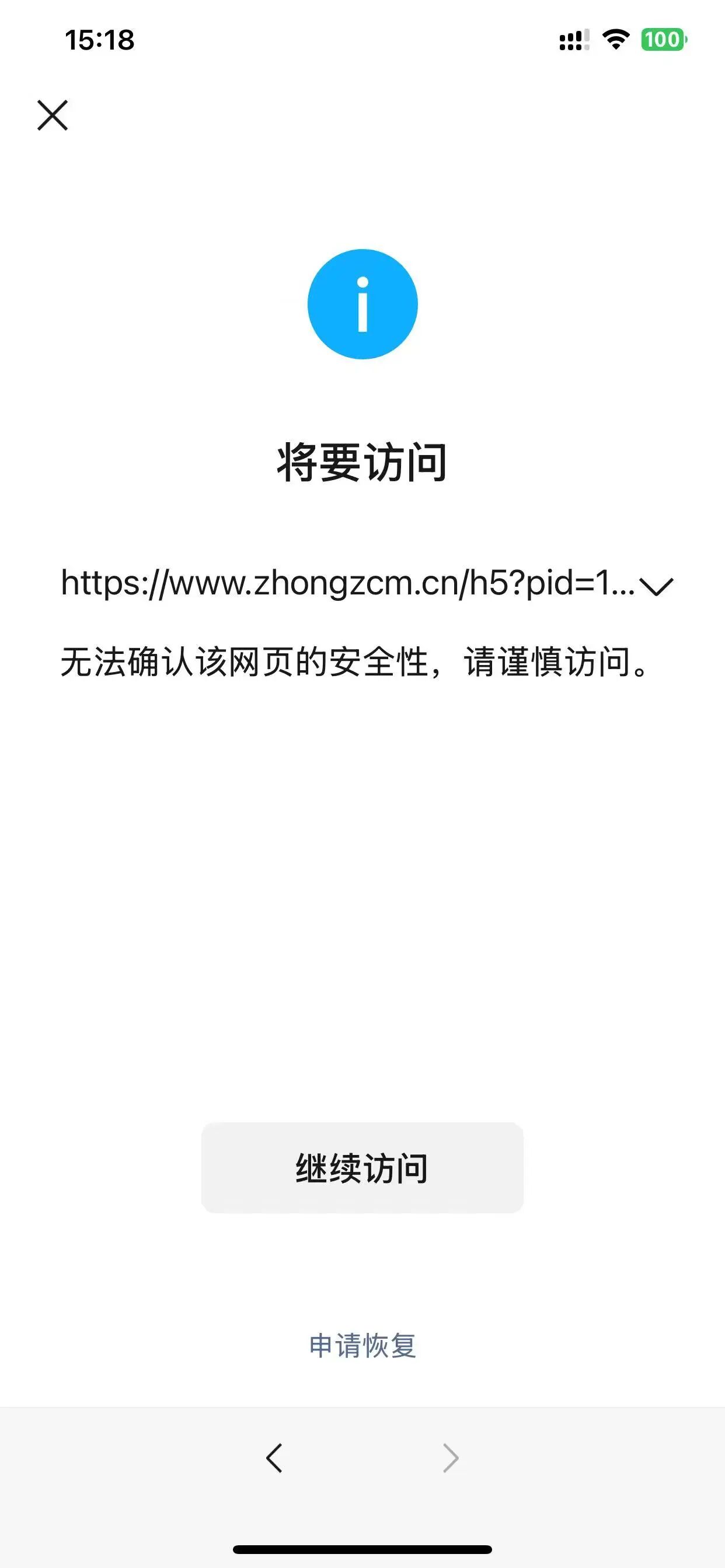 您好,域名zhongzcm.cn在阿里云备案通过,浏览器访问正常,也加了ssl证书。我是网站开发者,访问如图,https://www.zhongzcm.cn/h5微信访问网站出现“无法确认该网页的安全性,请谨慎访问”,经检查网页里没有不安全的内容,请核实后帮忙解除拦截,谢谢!