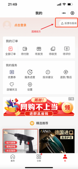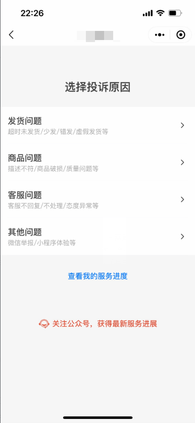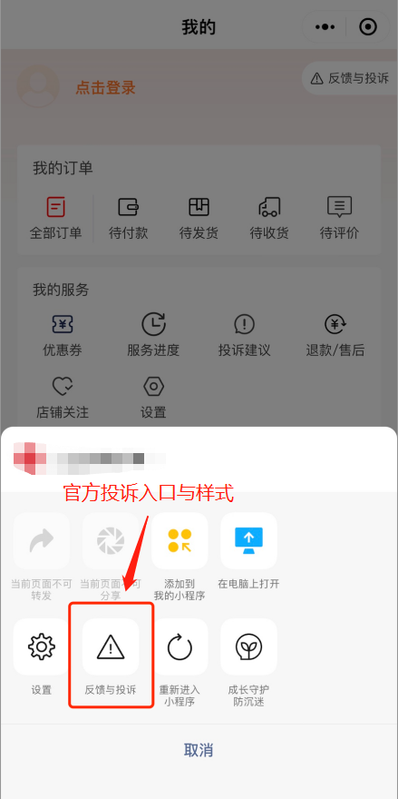 小程序中的投诉入口样式与官方投诉入口icon+名称完全一致,或带有微信气泡图标、“微信官方”等字眼的,涉嫌混淆官方投诉入口,可能造成C端用户误解。