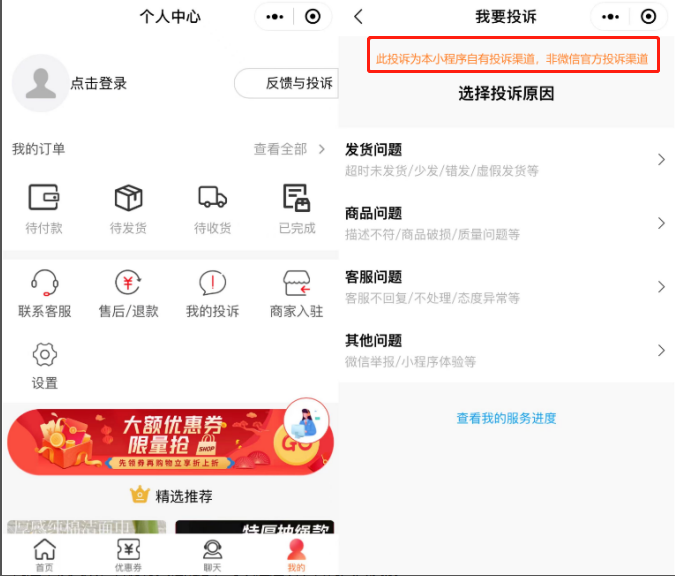 2、小程序的自有投诉页面需置顶提示“此投诉为本小程序自有投诉渠道,非微信官方投诉渠道”。