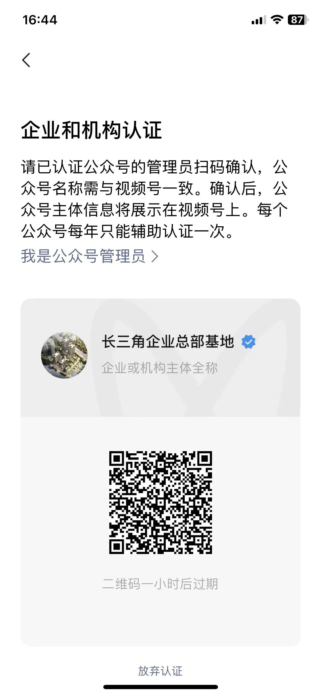 公众号麒麟长三角企业总部基地(企业认证)需要关联视频号“长三角企业总部基地”,遇到问题如下:一是视频号名称改不了“长三角企业总部基地”改不了“麒麟长三角企业总部基地”;二是公众号“麒麟长三角企业总部基地(企业认证)”的管理员认证不了视频号,认证页面显示灰色。