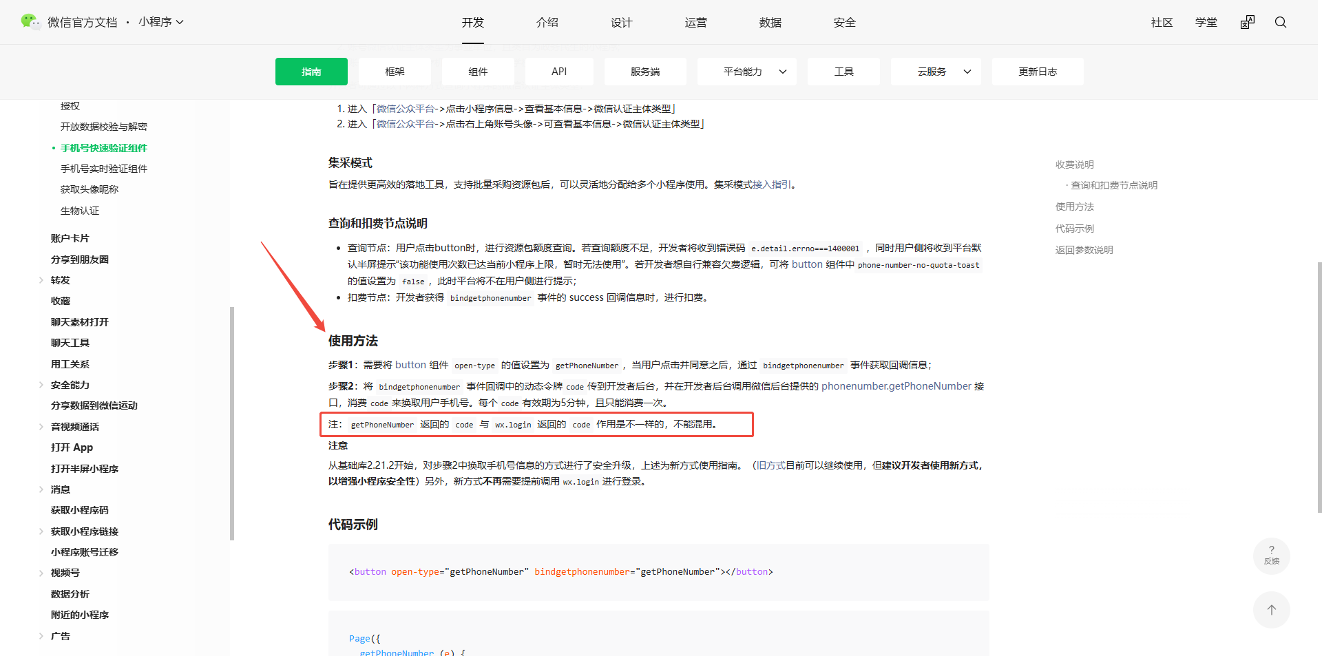 注:getPhoneNumber 返回的 code 与 wx.login 返回的 code 作用是不一样的,不能混用。