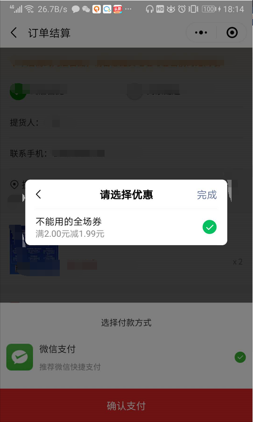本来有两张代金券,删了一张满2减1.99的,结果下单支付的时候还是能用