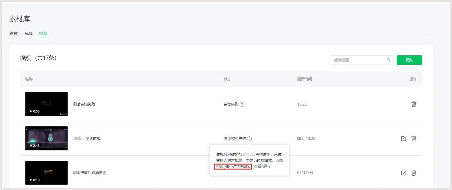 (1)网页端可在视频状态点击“?”查看,如有异议可提供相关证明材料申诉(48小时内有效)。平台会尽快核实处理,请及时留意公众号站内信通知。详情可查阅《微信公众平台视频原创保护指引》。