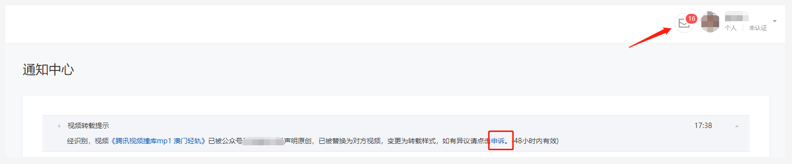 (2)如果是通过腾讯视频链接插入群发的视频,可在公众号通知中心视频转载提示内查看并申诉。