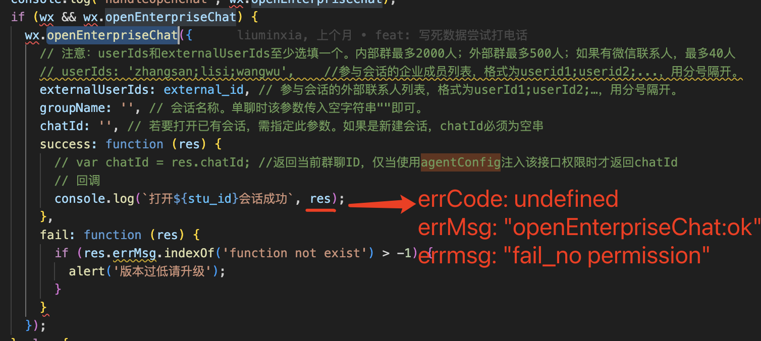 errCode : undefined errMsg : "openEnterpriseChat:ok" errmsg : "fail_no permission"
