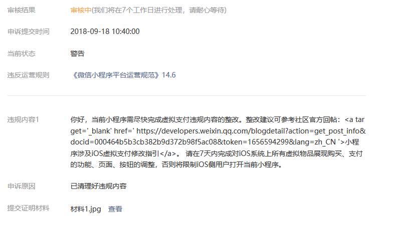 你好,小程序申诉7个工作日内审核完毕,请留意申诉结果。