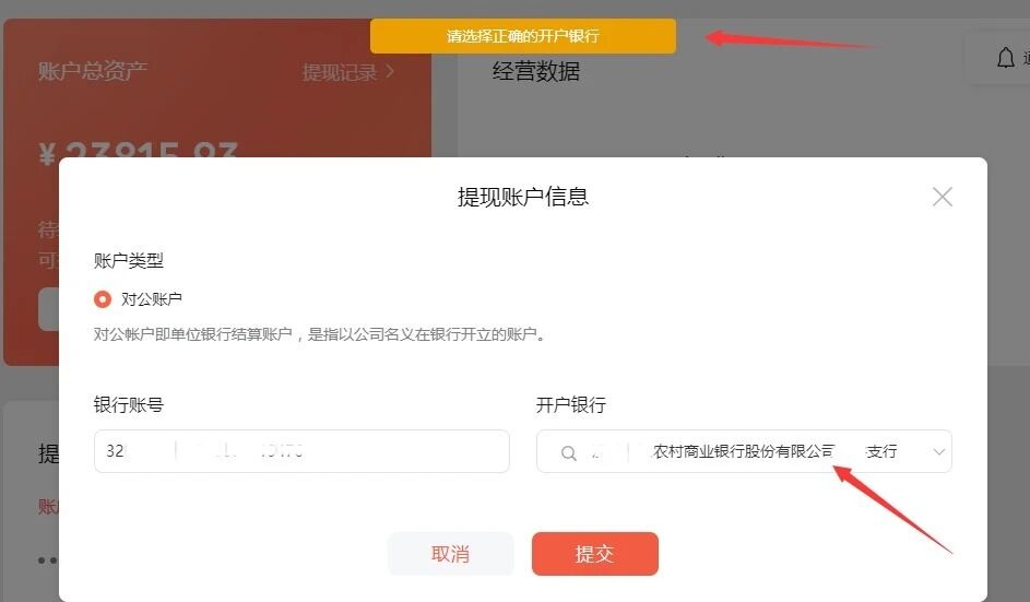 开店审核时没有任何问题,现在需要提现却显示账户不可用,重新更换选择开户行却无法选择到准确的开户银行,这种情况是怎么回事啊?有没有遇到过的啊?求教!!