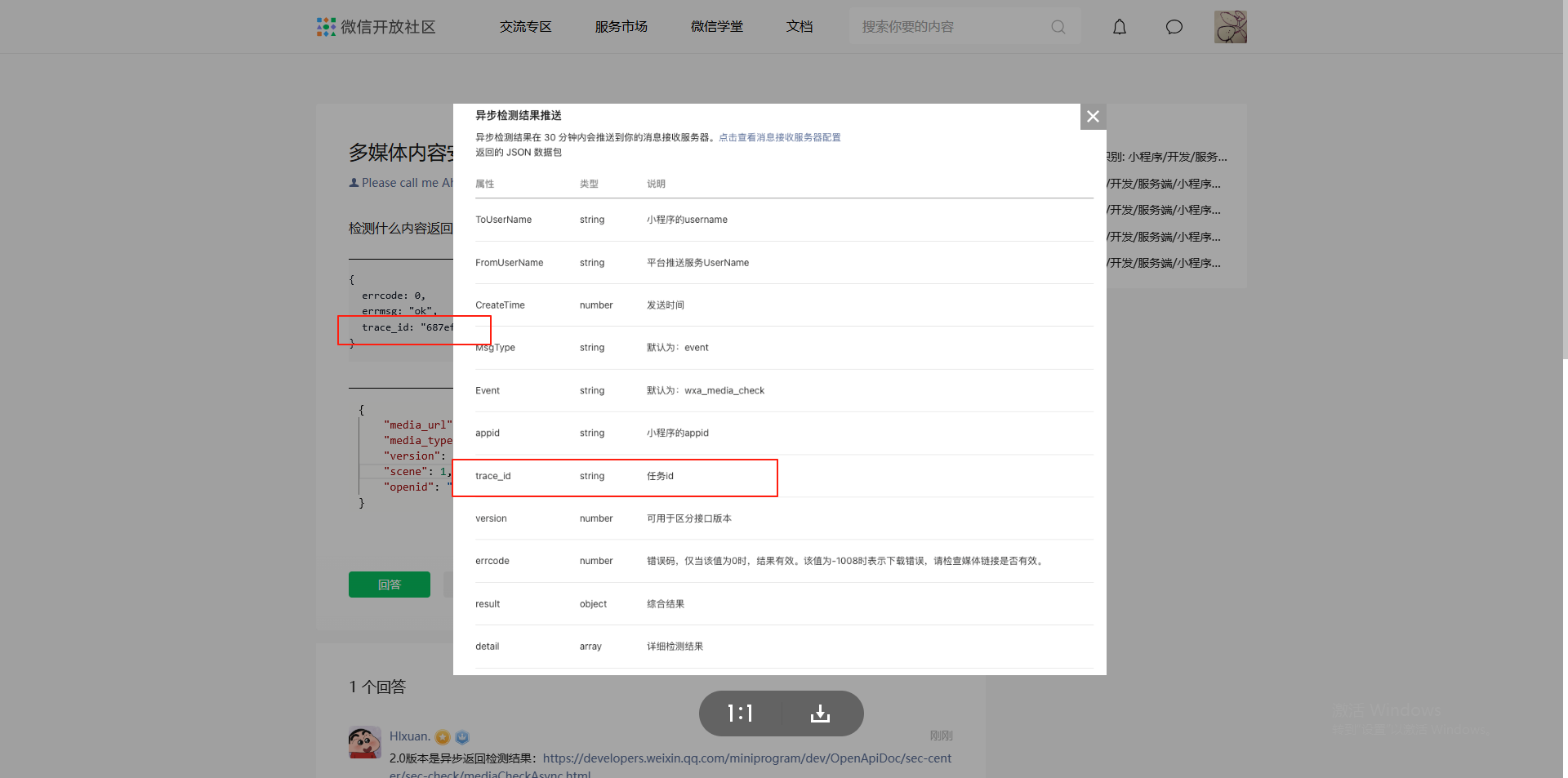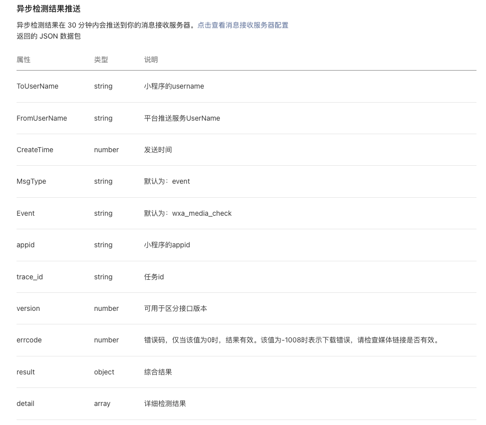 2.0版本是异步返回检测结果:https://developers.weixin.qq.com/miniprogram/dev/OpenApiDoc/sec-center/sec-check/mediaCheckAsync.html