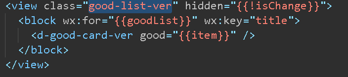 <view class="good-list-ver" hidden="{{!isChange}}"> <block wx:for="{igoodList}}” wx:key="title"> <d-good-card-ver class="good-list" good="{{item}}”/> </block> </view>