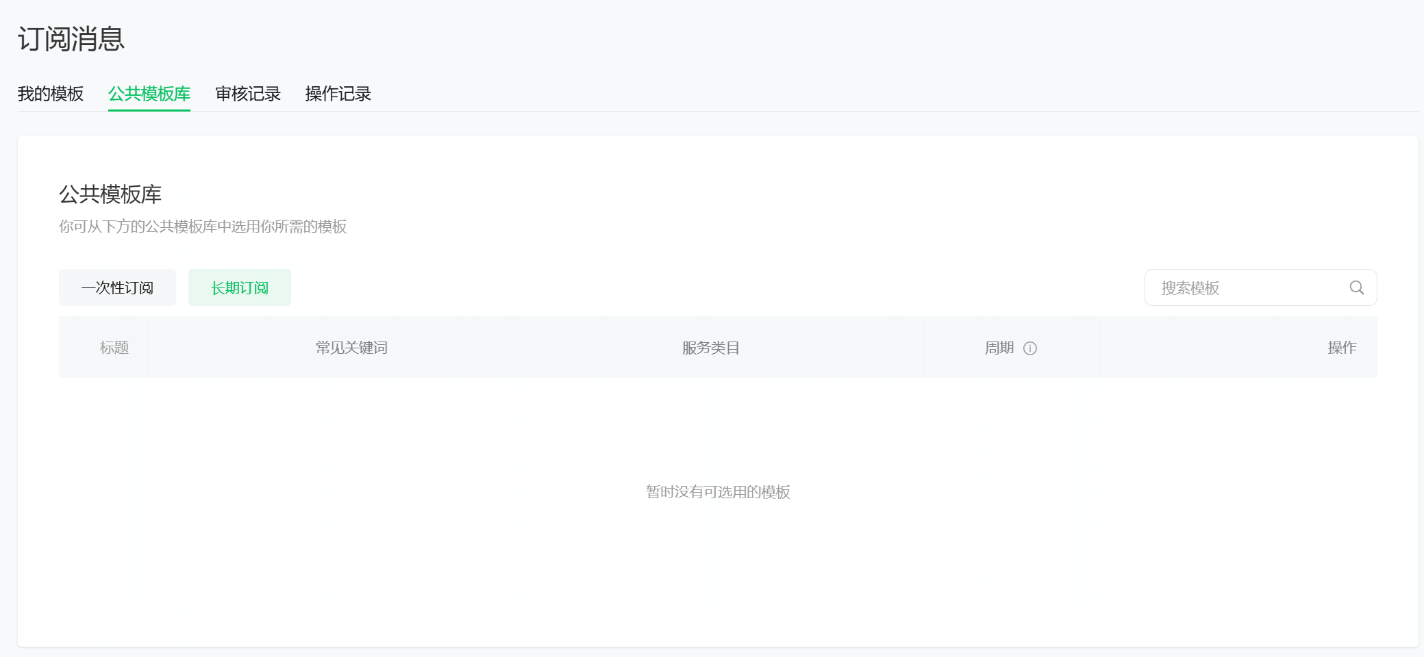 你好,长期订阅消息目前只对政务民生、医疗、交通、金融、教育等部分二级行业类目进行开放,长期订阅目前只支持少量民生公共服务节点通知,并非所有场景都支持,长期订阅模板库有模板可以进行调用,没有模板说明暂时不支持;暂未支持的场景建议通过一次性订阅实现。