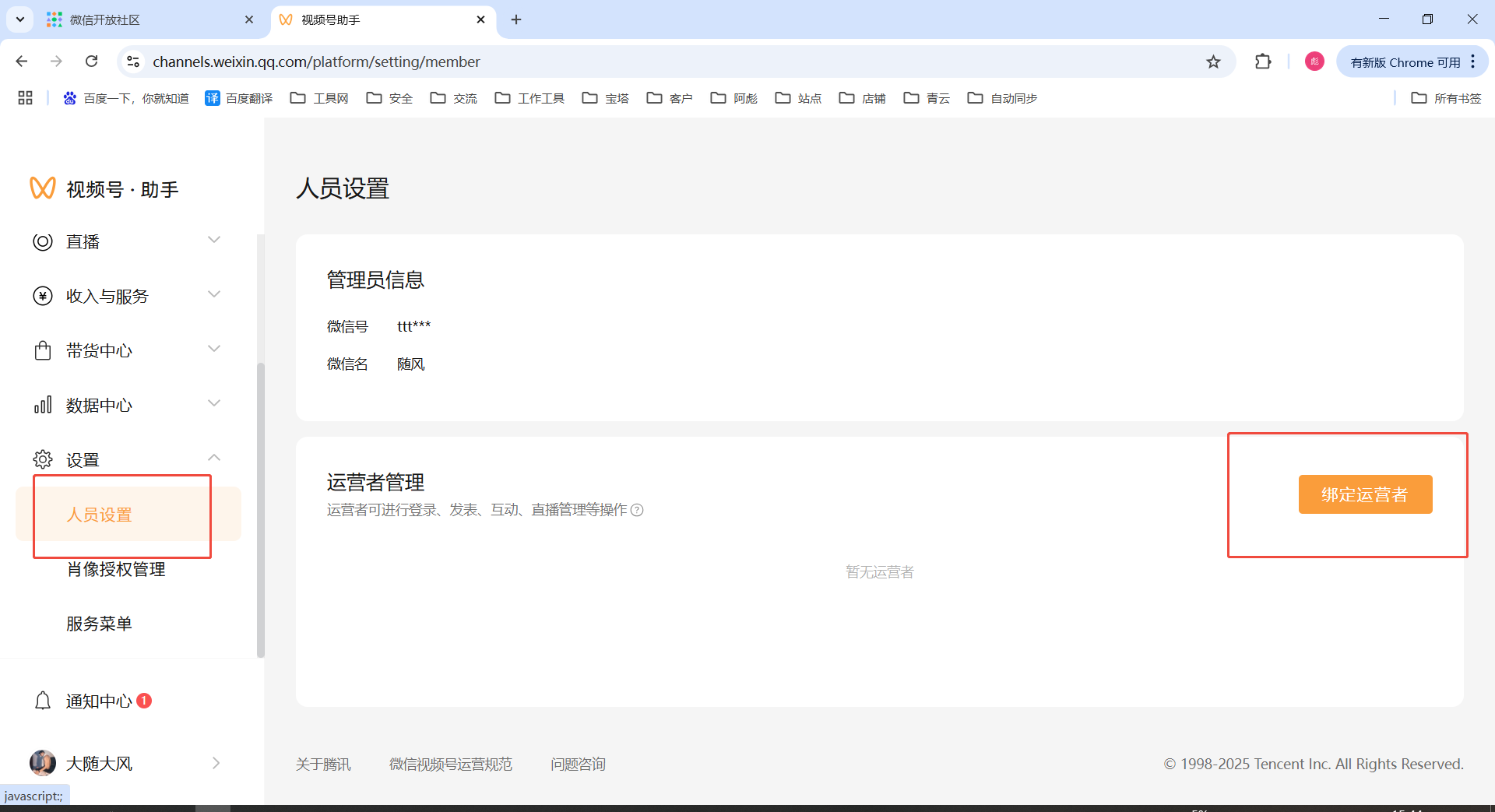 登入进去后点击人员设置,点击绑定运营者,别人就成了你的管理员