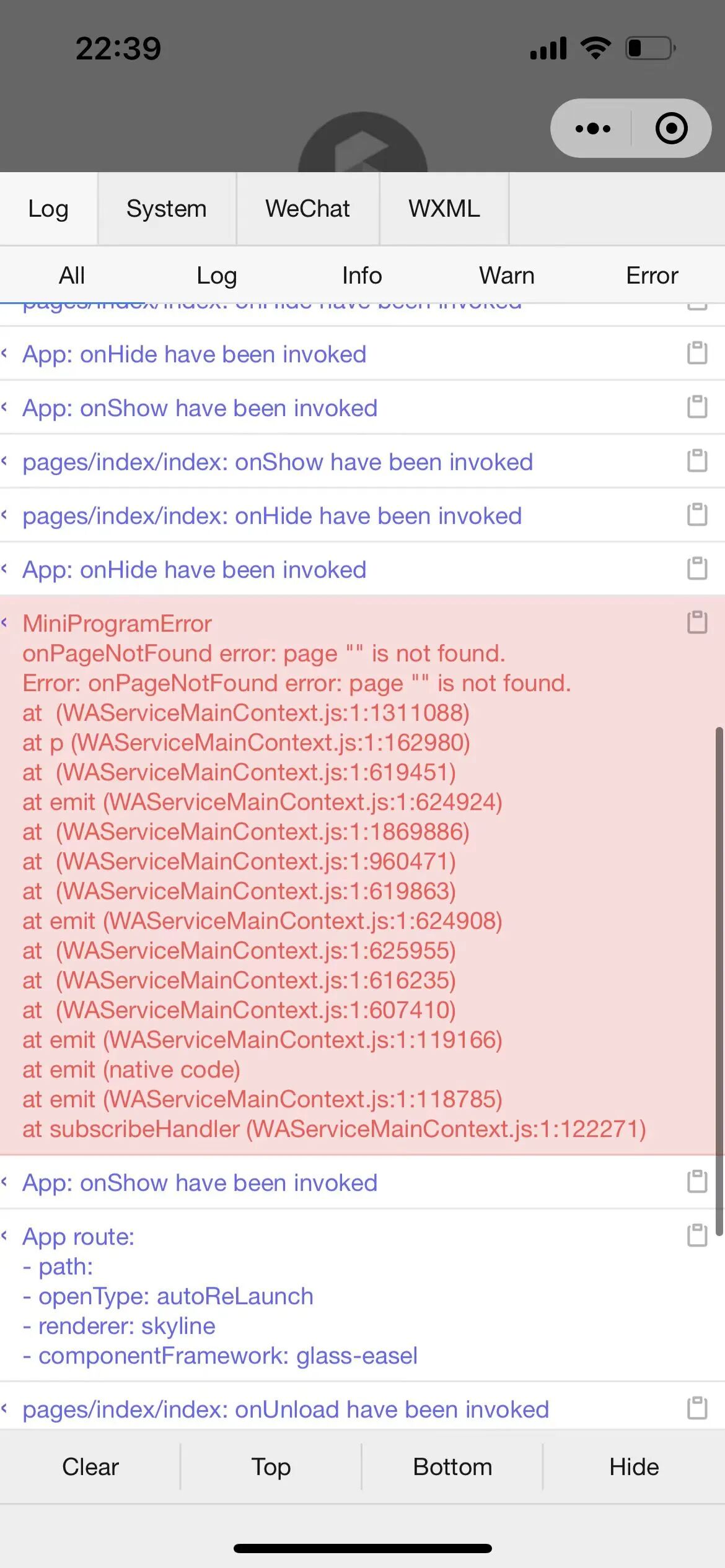 第三:在微信中,选择发现tab,选择小程序,在最近使用中找到刚刚访问的小程序,点击,出现上图二,此时点开vconsole之后,控制台出现上图三的报错。