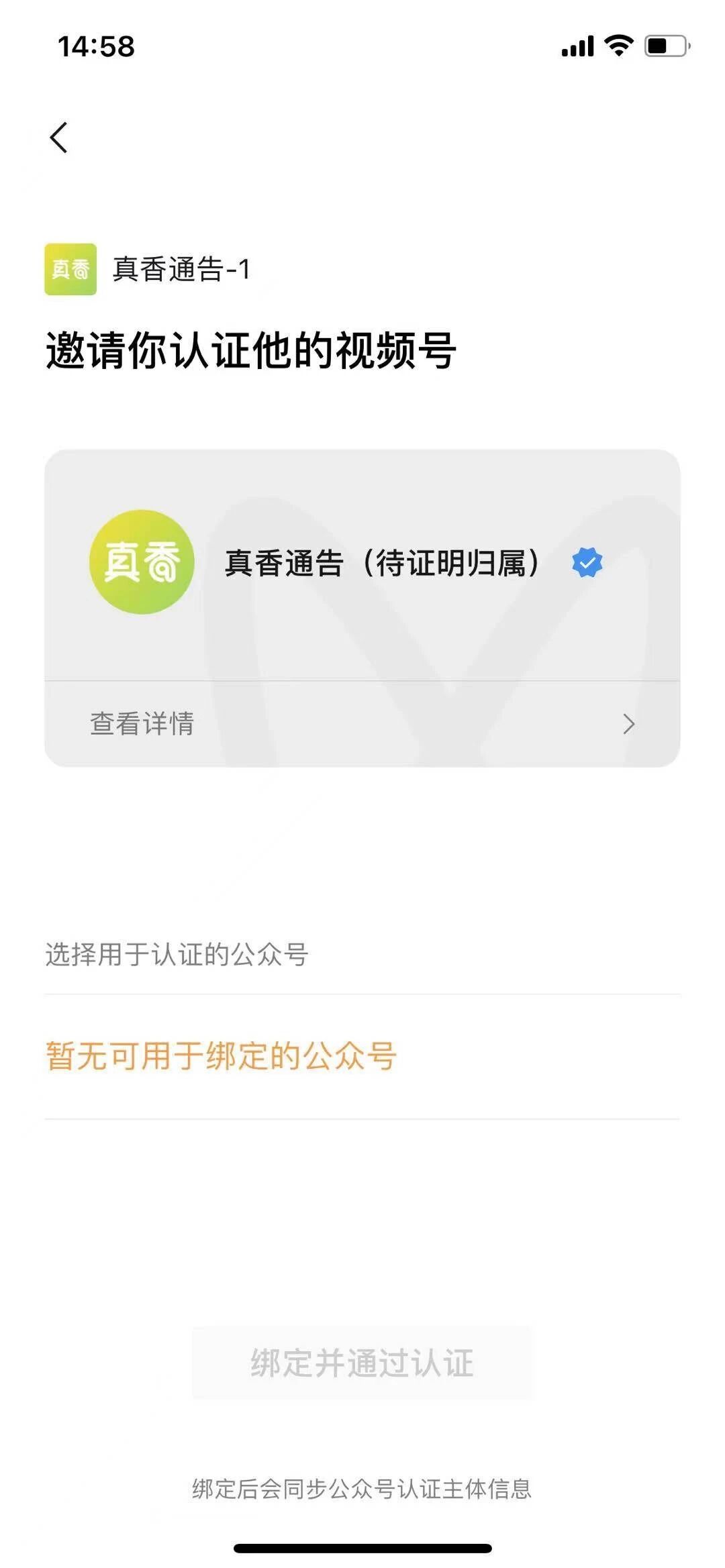视频号申请与已认证的公众号绑定名称主题统一为什么显示无可认证的公众号,辛苦!官方人员看到可以尽快给到回复哦!急!