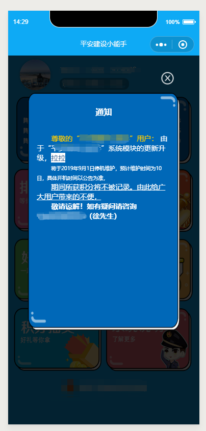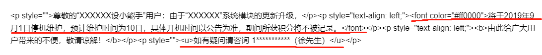 <p style="">尊敬的“XXXXXX设小能手”用户:由于“XXXXXX”系统模块的更新升级,</p><p style="text-align: left;"><font color="#ff0000">将于2019年9月1日停机维护,预计维护时间为10日,具体开机时间以公告为准,期间所获积分将不被记录。</font></p><p style="text-align: left;"><b>由此给广大用户带来的不便,敬请谅解!</b></p><p style=""><u>如有疑问请咨询 1***********(徐先生)</u></p>