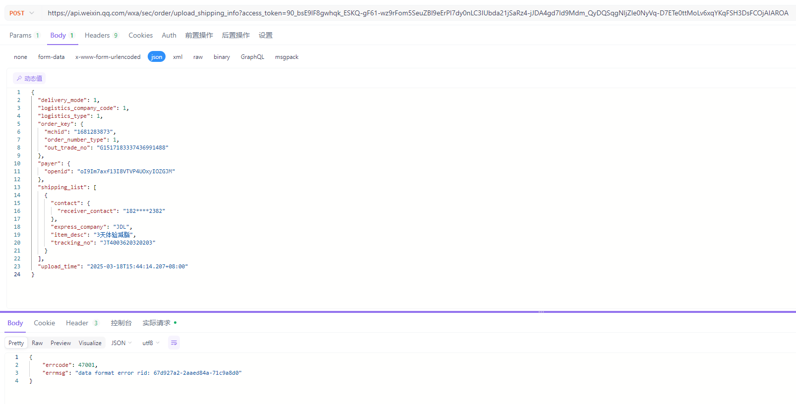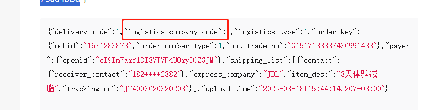 {"delivery_mode":1,"logistics_company_code":1,"logistics_type":1,"order_key":{"mchid":"1681283873","order_number_type":1,"out_trade_no":"G1517183337436991488"},"payer":{"openid":"oI9Im7axf13I8VTVP4UOxyIOZGJM"},"shipping_list":[{"contact":{"receiver_contact":"182****2382"},"express_company":"JDL","item_desc":"3天体验减脂","tracking_no":"JT4003620320203"}],"upload_time":"2025-03-18T15:44:14.207+08:00"}