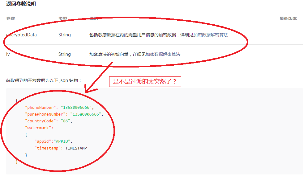点击getPhoneNumber按钮获取到 encryptedData 和 iv 数据后,下面就直接获取到包含手机号码的json数据,这里如何使用获取到的 encryptedData 和 iv 这两个数据,也没有明显的案例。虽然上面有说明:可以通过 bindgetphonenumber 事件回调获取到微信服务器返回的加密数据, 然后在第三方服务端结合 session_key 以及 app_id 进行解密获取手机号。但是在代码里如何做?