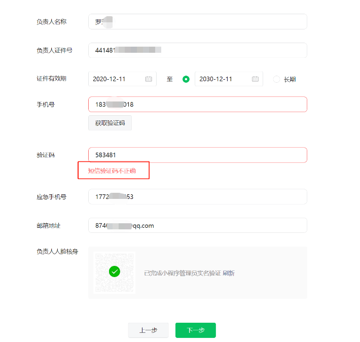 小程序备案,主体负责人填写部分一直接收不到验证码,接收到以后填写显示验证码错误