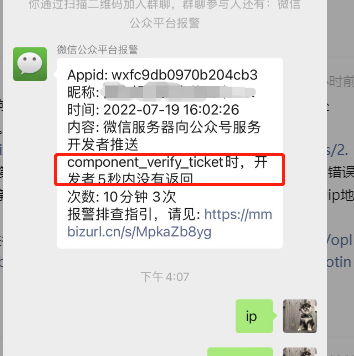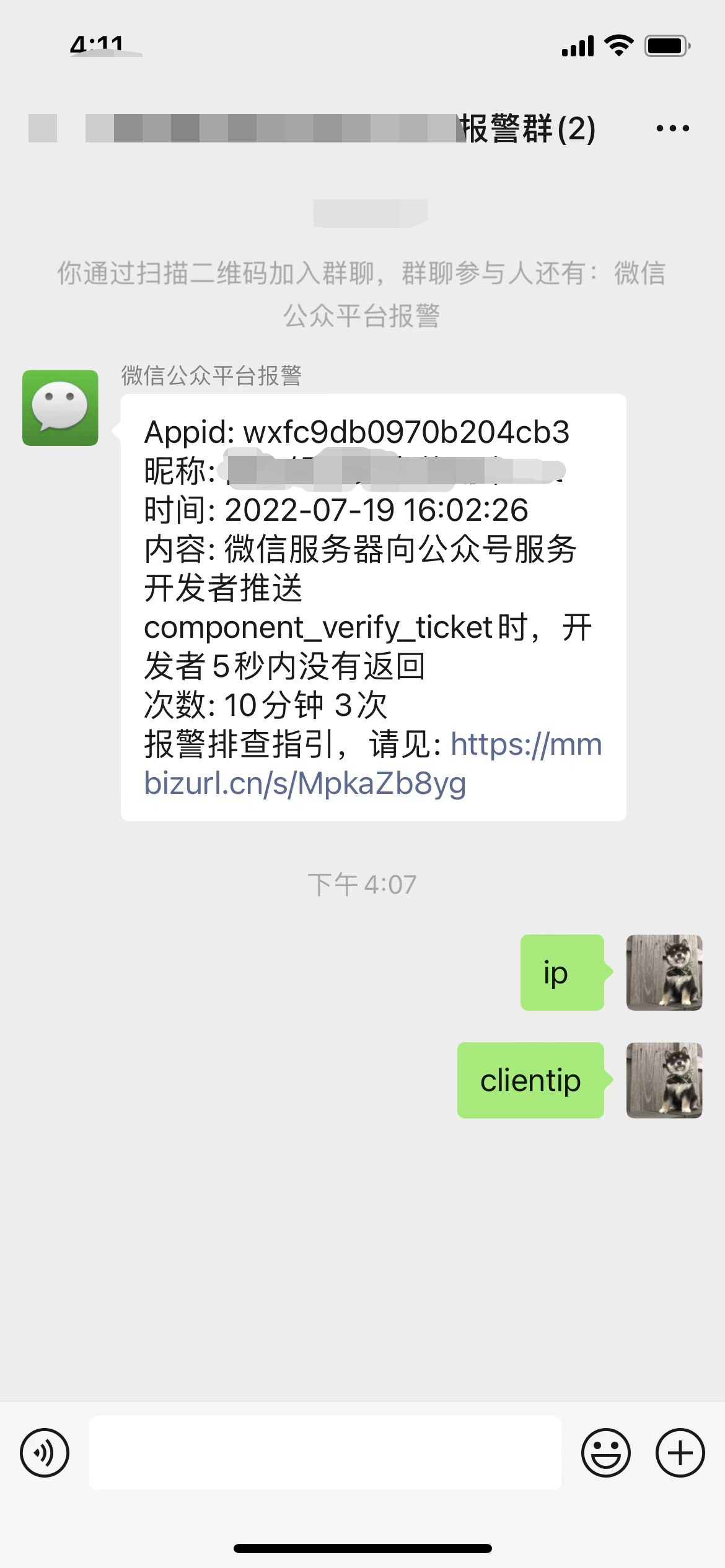 另外,请参考文档https://developers.weixin.qq.com/doc/oplatform/Third-party_Platforms/2.0/operation/thirdparty/alarm.html加入第三方告警群,告警信息群会将微信请求的clientip,错误信息,对应域名,对应域名解析的IP地址等信息推送至告警群中。根据告警群的信息,把对应的ip地址加入白名单,允许其访问你们的网络。