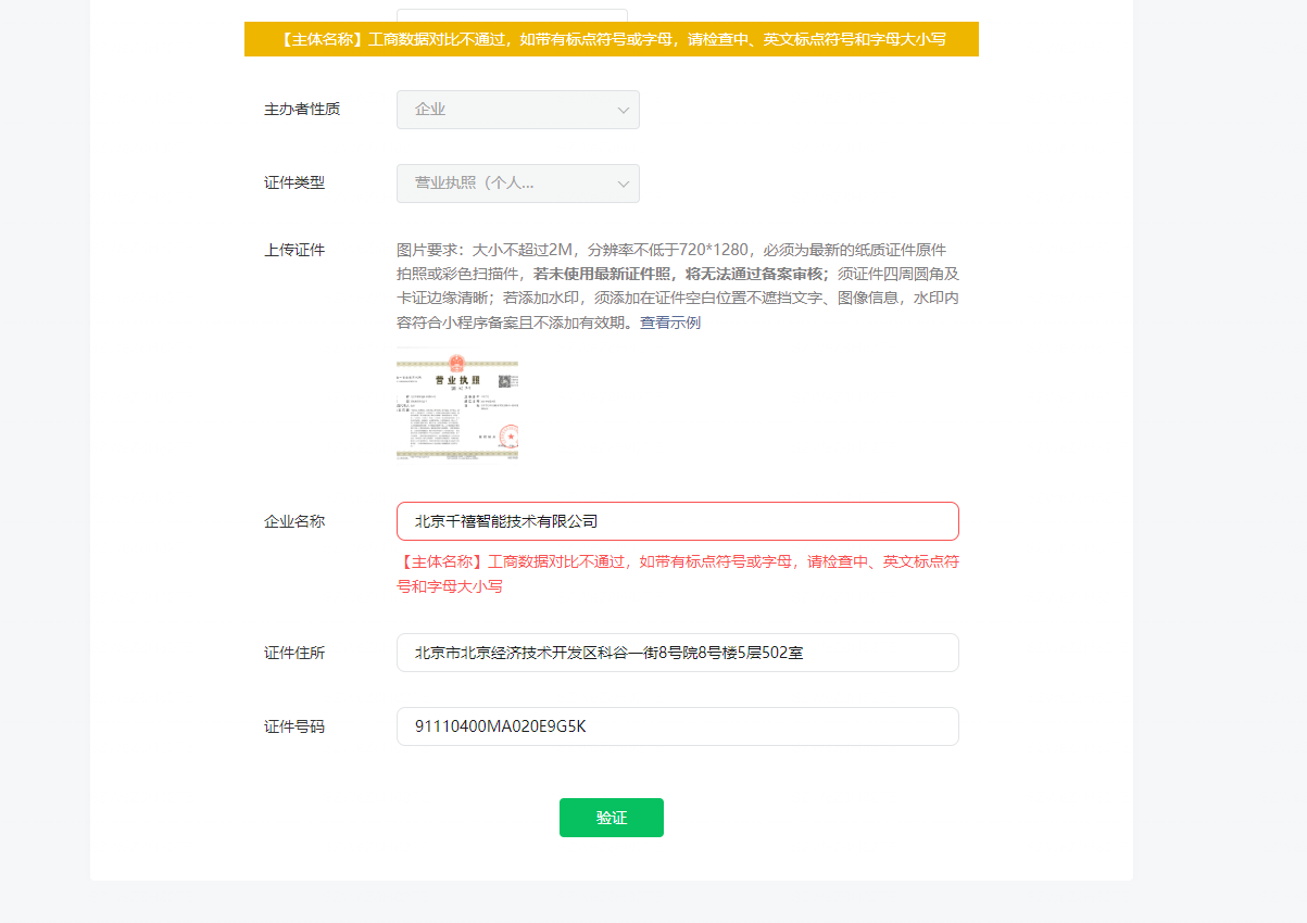 问题描述:点击去备案,跳转到“验证备案类型”,填写完信息点击“验证”按钮报错。已按官方文档排查(核对标点符号、大小写、空格等细节),企业名称变更的核准日期也超过15个工作日了,还是验证不了,无法进入下一步。
