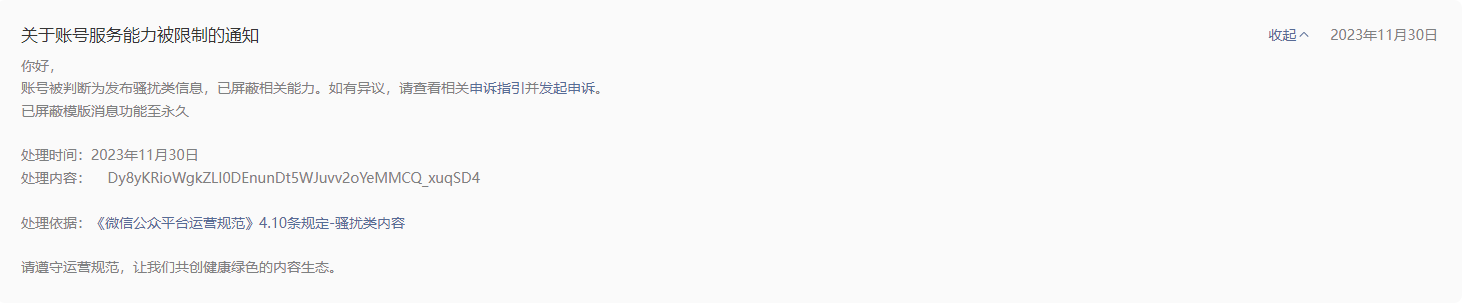 以上对我司封禁的消息当时没有看到,这2天才看到并进行了申诉处理。
