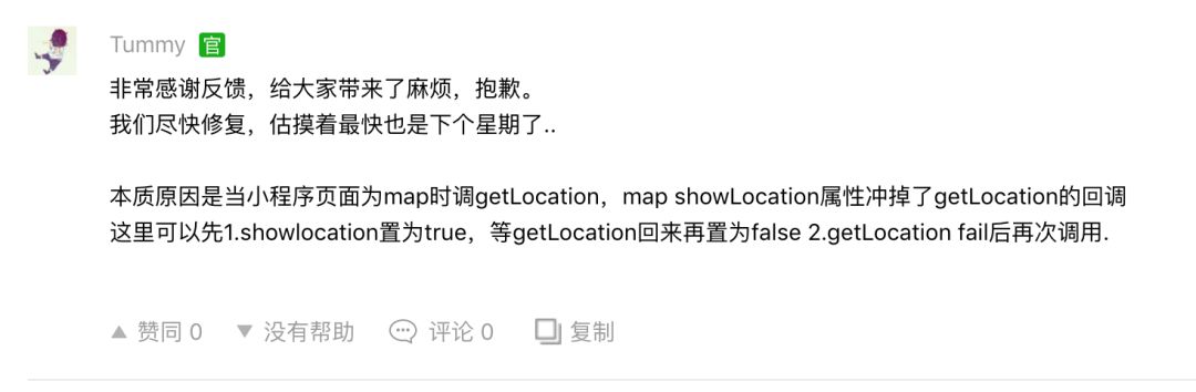 本质原因是当小程序页面为map时调getLocation,map showLocation属性冲掉了getLocation的回调这里可以先1.showlocation置为true,等getLocation回来再置为false 2.getLocation fail后再次调用.