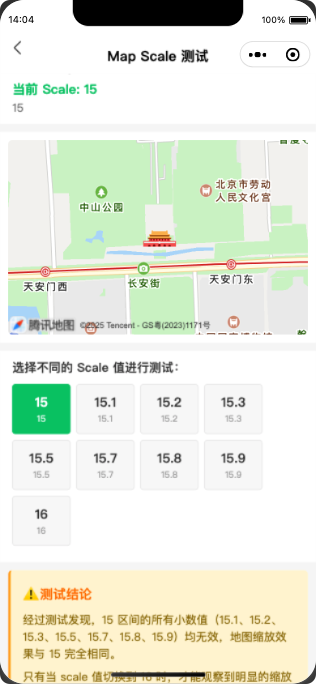 经过测试发现,15 区间的所有小数值(15.1、15.2、15.3、15.5、15.7、15.8、15.9)均无效,地图缩放效果与 15 完全相同。