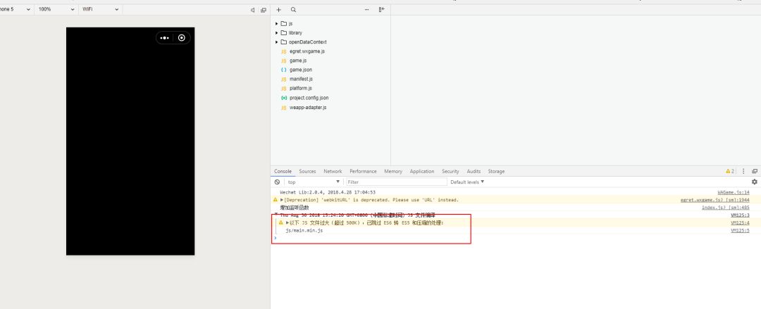 如图,单个js文件超过500k,提示已跳过 ES6 转 ES5 和压缩的处理,游戏黑屏