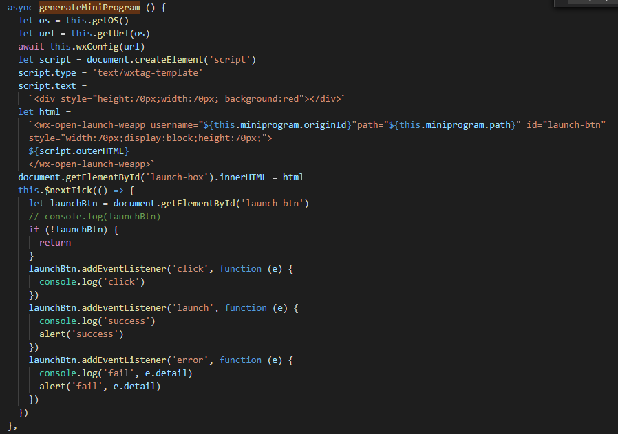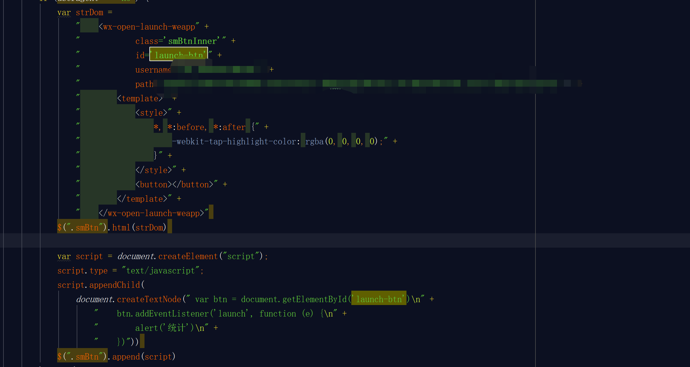 var script = document.createElement("script"); script.type = "text/javascript"; script.appendChild( document.createTextNode(" var btn = document.getElementById('launch-btn')\n" + " btn.addEventListener('launch', function (e) {\n" + " alert('统计')\n" + " })")) $(".smBtn").append(script)https://developers.weixin.qq.com/community/develop/article/doc/000c00b4490678f528baf2cf756413看看我这篇,可能对你有帮助