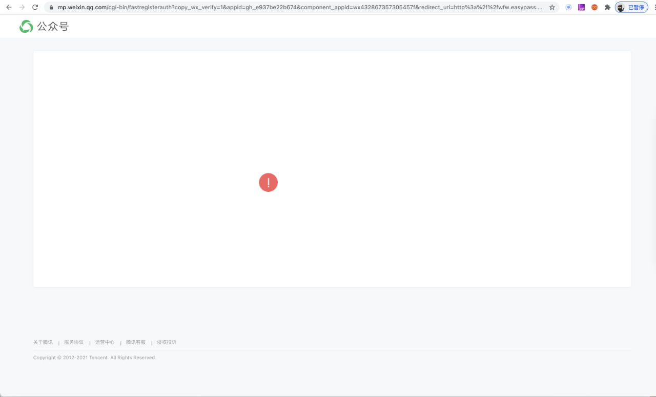 问题描述:服务商快速复制公众号主体(公众号授权已经完成)代开通小程序时,从我方平台页面授权入口,跳转到的微信公众平台授权注册页时,页面出错