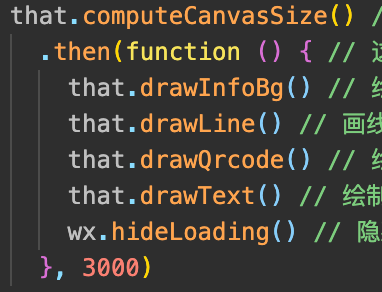 that.drawInfoBg() // 绘制底部白色背景that.drawLine() // 画线that.drawQrcode() // 绘制小程序码that.drawText() // 绘制文字wx.hideLoading() // 隐藏loading一个一个来draw吧,同时draw可能会有问题。同步来。。。。。。是我写的不明白还是啥,有没有大神帮看看怎么破?或者有不用创建节点的做图方法?