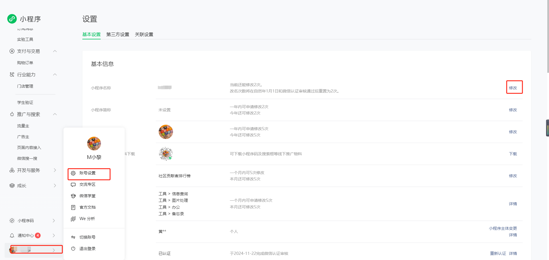 小程序后台,账号设置=》基础信息