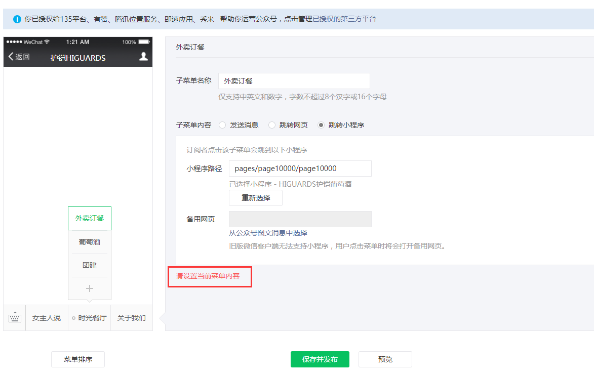 这个选择跳转到小程序,点击保存并发布,提示这个,这个在哪里设置?请各位大神帮忙解决下,谢谢